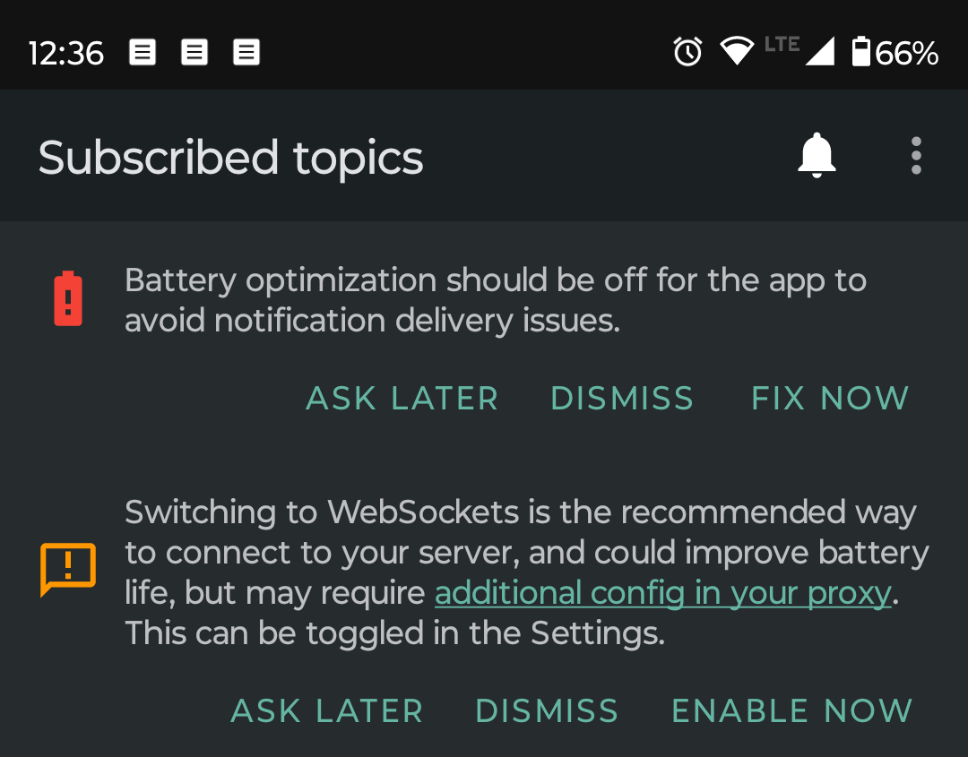For any Android users, you should turn off battery optimization and switch to Websockets to make it work properly. For a long time, I wasn't getting notifications sent unless I refreshed daily. These past two weeks, I'm finally getting notifications without having to refresh.