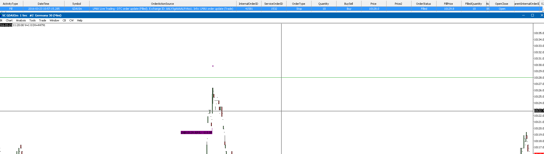 Regarding stop order triggering, this is from LMAX: We realised the problem. The setting for "Bid/Offer Stops" needs to be applied to the Master FIX connection for it to apply to the sub-accounts. The only drawback to this is that the setting will apply to ALL Stop orders you place on any sub-account, regardless if the sub-account has the setting enabled or not. Not sure how to resolve this because most likely people want different settings? Sierra Chart Support - Engineering Level Your definitive source for support. Other responses are from users. Try to keep your questions brief and to the point. Be aware of support policy: https://www.sierrachart.com/index.php?l=PostingInformation.php#GeneralInformation For the most reliable, advanced, and zero cost futures order routing, *change* to the Teton service: Sierra Chart Teton Futures Order Routing Date Time Of Last Edit: 2016-03-24 16:37:22