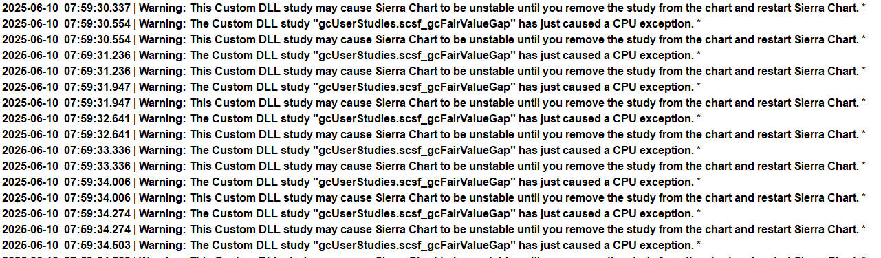 @User731023 Interesting lol just to get it out of the way: Are you on a laptop or desktop? what kind if CPU do you have? Are you using OpenGL(with a GPU)? I use this study on 4 different charts and haven't had that log message pop up or notice any kind of lag when working my charts. |