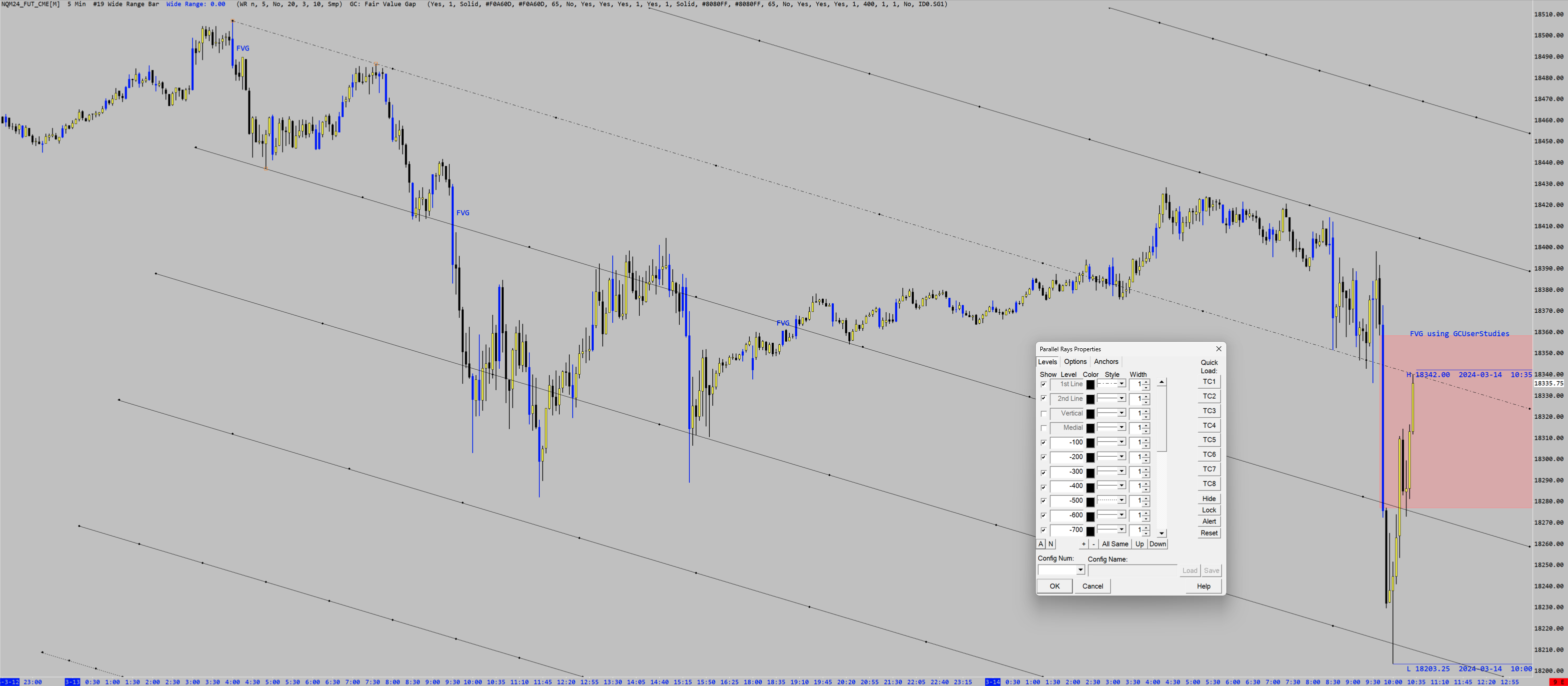 are Sierra charts looking at creating this FVG (Fair value gap) indicator? there has been plenty information supplied to progress this from what i can see. The study mentioned above works great. https://gcuserstudies.github.io/ No need for Sierra to do anything here unless they want to add it to their own indicators and give credit. The code is provided on GitHub so you can also modify it to fit your own studies: https://github.com/gcUserStudies/sierrachart SierraChart already has a Wide Range Bar study that will show you the same thing (basically). And also, FVG is really an ICT term, isn't it? Most of his ideas are from other educators. Not sure I have found anything that makes him or the FVG unique. You will find that Andrews taught the same thing in his Action Reaction course in the 1960s and 1970s. If you draw his median lines (expansion) on any expansion in price, you will see the lines zooming his levels. Furthermore, the pitchfork gives you the premium/discount/equilibrium that ICT teaches because the median line shows equilibrium after price has passed to two extremes. It also shows you the measured moves from those two extremes so that you have a way measure how far price can go further and how much risk you wish to take on your trade. It's even the same as his Trader's Trinity method that he was teaching back in 2011/2012 where he shows you the trinity of price levels (overbought, fair value, oversold) that you apply across a trinity of time (monthly, daily, weekly) based on Alexandre Elder's Trading for a Living book that ICT talked about in his YouTube Scout Sniper series. Furthermore, if you use warning lines (which SierraChart allows as many as you wish), it gives you all of his expansion levels and you can watch your FVGs appear on all of those as price zooms the levels. If you draw the pitchfork at the base of one of ICT's MMxM (pockets in price aka mountains and valleys) and add your warning lines, you will be able to watch price zoom those lines and often stop right on one of them at 3 or 5 measured moves away. ICT calls measured moves, standard deviations, and he uses a fib tool to measure them, but they are the same thing and standard deviations really isn't the right name to use, since it is more useful in Options trading when describing the probability of price moves. ICT talks about watching time, but Andrews did as well, even telling his students to watch when highs and lows form on the days of the week and to collect statistics about those for the instrument they are trading. And I think Schabacker covered all the other stuff in the 1930's (types of gaps, accumulation/manipulation/distribution, etc. See pg 572 and 861 in his Stock Market Theory and Practice book. I know he covers multiple time frame analysis in his other book Stock Market Profits quite early in the book.) And honestly, the parallel lines/rays tool on SierraChart allows you to make a very nice price grading. You can draw it also on the base of any pocket. That is the basis for a fork. It is a measured move and based on Action/Reaction lines that were used by Babson back in the days of Gann's work. If you like ICT's concepts, you can take either tool and put in -100, -200, -300 etc and then 200, 300, etc. Then draw your line along the base of a mountain or valley pocket in price (MMxM). You will then be able to follow the measured moves in price as it moves through each. What you will notice is that they follow the rules set out by Babson and Andrews. Which is the same thing that ICT teaches with his FVG and IFVG. When price passes through a line, if it creates a gap/zoom, it will often come back to touch it. You then can get a good entry for the continuation. So, I don't know that having a FVG indicator is very useful because it's been there all along with the fork tool in SierraChart. Hope that helps you sort it out with the FVGs. I've attached a chart showing you what the Sierra Chart Wide Range Bar studies accomplishes and also comparing it with the GCUserStudies tool and overlaying a parallel rays tool that shows you where to expect those FVGs to form using technology from the 1890s and 1960s. Cool isn't it? |