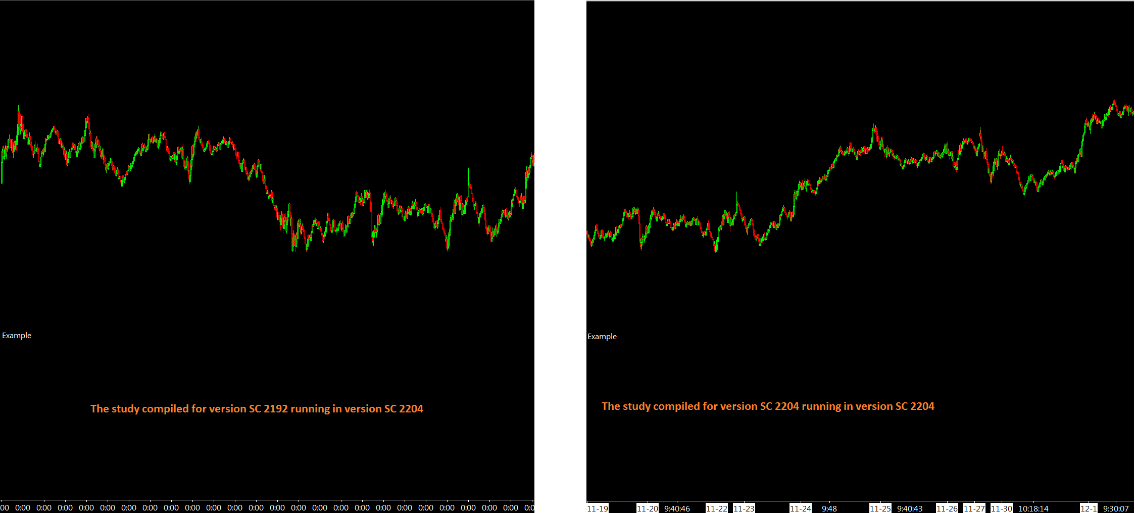 The return type for the following ACSIL functions has been changed from a double type to SCDateTimeMS. Previously this was not done when the new integer based SCDateTime/SCDateTimeMS were released since using these types as a return value would lead to an invalid return value when using other compilers other than Visual C++. We have tested again with the compiler used for the Sierra Chart Remote Build functionality and do not observe any problem with this. So we have now changed the return type to SCDateTimeMS. It was necessary to make this change because there is a small degree of floating-point error when using a double type that would lead to a time value being off by a microsecond which can cause a problem when that is not expected. Therefore, any ACSIL study which uses these functions needs to be recompiled for version 2195 or higher. If the study is not recompiled, then the functions will do nothing and add an error message to the Sierra Chart Message Log.: sc.GetStartDateTimeForTradingDate, sc.GetTradingDayStartDateTimeOfBar, sc.ConvertDateTimeToChartTimeZone, sc.DateStringToSCDateTime, sc.AdjustDateTimeToGMT, sc.TimePeriodSpan, sc.TimeStringToSCDateTime, sc.DateStringDDMMYYYYToSCDateTime, sc.CalculateTimeSpanAcrossChartBars, sc.GetEndingDateTimeForBarIndex, sc.GetEndingDateTimeForBarIndexFromChart, sc.ConvertDateTimeFromChartTimeZone, sc.ConvertDateTimeFromChartTimeZone. https://www.sierrachart.com/index.php?page=doc/Whats_New.php#SCVer2195 Version 2195 can cause problems with some studies (in previous versions they work fine and in the last not for example: Yesterday last SG value) Please do not upgrade to the latest version, I will try to solve it over the weekend. This applies to the Free2019 and Free2020 libraries so more than 800 users. It will be given priority over new developments. I apologize for the complications associated with it. Date Time Of Last Edit: 2020-11-13 19:23:35