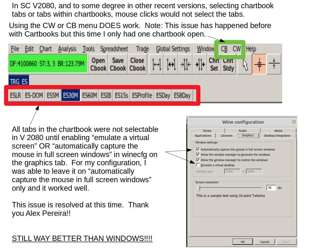 ertrader, I also don't have that issue ( If you are talking about the chartbook tabs ). Can you try it like I mentioned previously ? ( Actually there is no need to go into the command line, just enable the option of "emulate a virtual screen" in winecfg ). ( I run it inside a virtual screen because I have some kwin rules for SC by title, and it seems that SC changing title so fast always, creates a 1~3% extra cpu usage with kwin+lattedock ) |