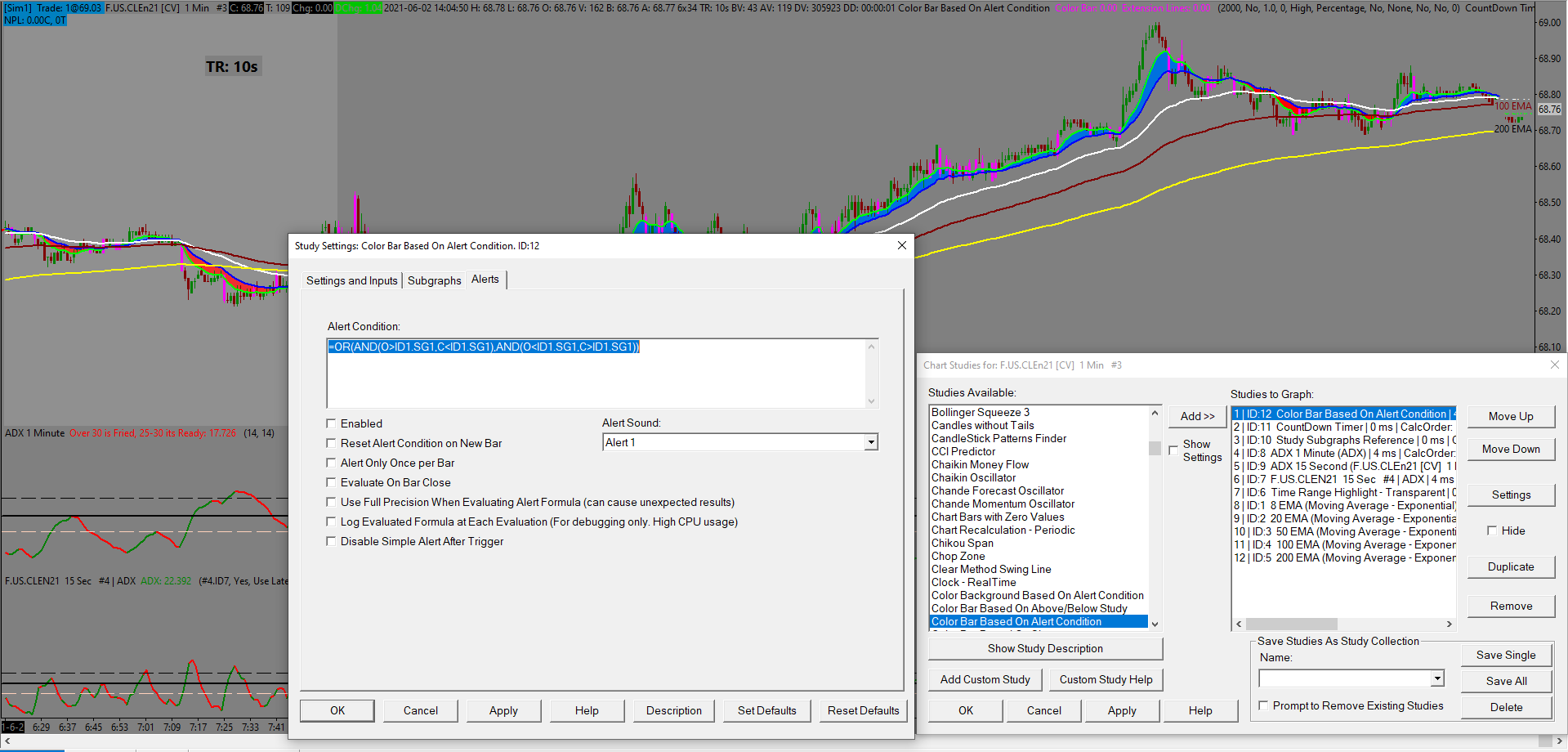 User628616) Try study from Sierrachart default list "Color Bar Based on Alert Condition" with alert: =OR(AND(O>ID1.SG1,C<ID1.SG1),AND(O<ID1.SG1,C>ID1.SG1)) You can find the collection for that on my forum in the free section ... |