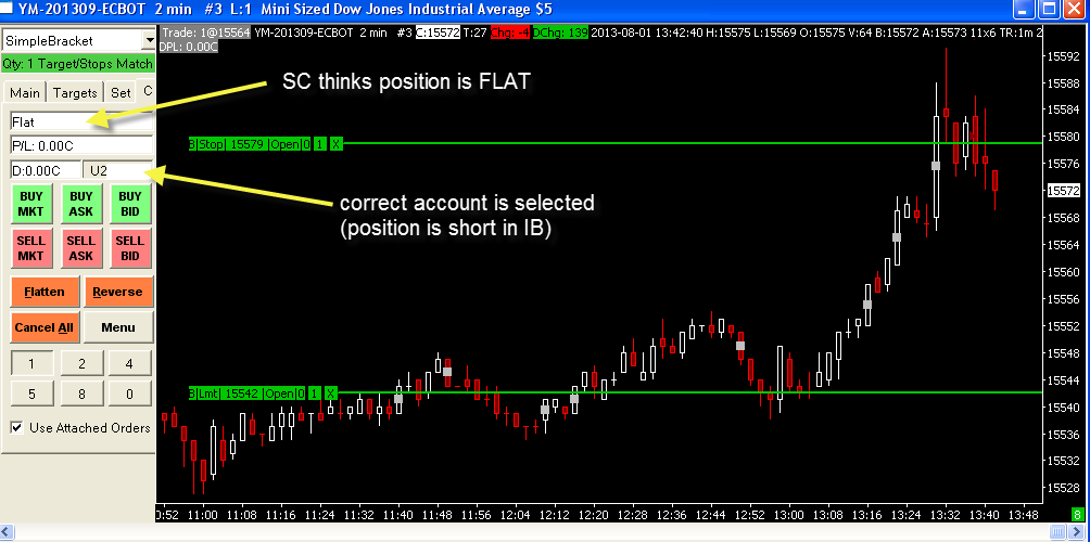 Hello, I have to report, that version 1002 has problem with tracking open position. This is something I reported earlier and was corrected (version 997 does not have this problem). See example of todays live trade. I entered trial trade short in YM on my live IB account. While I was still short, sierra erased the line informing about open profit and displayed “Flat”. It continued to display stop-loss and profit target. After my profit target was hit, it showed for about 2 seconds that there is a new long position opened from my profit target (but it corrected itself to No position after that 2 seconds). But there is definitely problem now that Sierra losses track of opened positions. This problem is not present in version 997 that I use normally. |