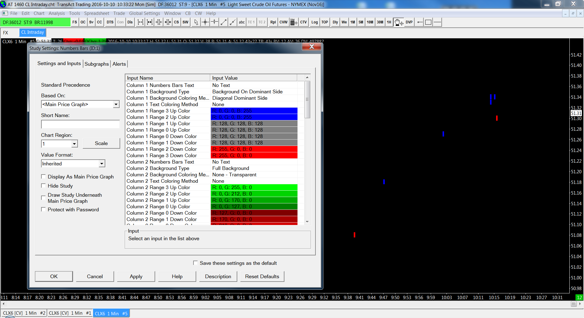 Afraid I still don’t have the rest of the number bars (see attached). I’ve set the Bid/Ask Minimum Volume Compare Threshold to 200 to filter out the smaller volume (I’m on crude) so what you’re seeing on my chart is just those prices where the volume is in excess of 200, but you can’t see the rest of each bar i.e. you can’t see the highs and lows.