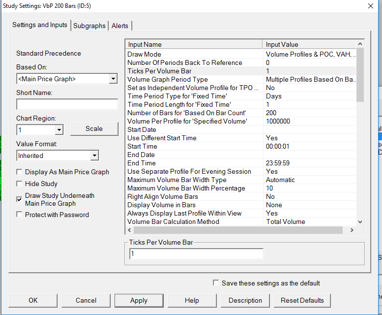 Hi, I have easy questions about VbP: I want to create a layout where: - VbP shows me the volume of the day, and the day after it creates a new VbP I'd like that every VbP's duration is from 00:00:01 to 23:59:59 I can't create this because in its settings is required the number of bars for "Based on Bar Count" In attach (from 1 to 4) there are my previous settings - Is it possible to keep VbP study always on the left of the chart? Best Regards! |