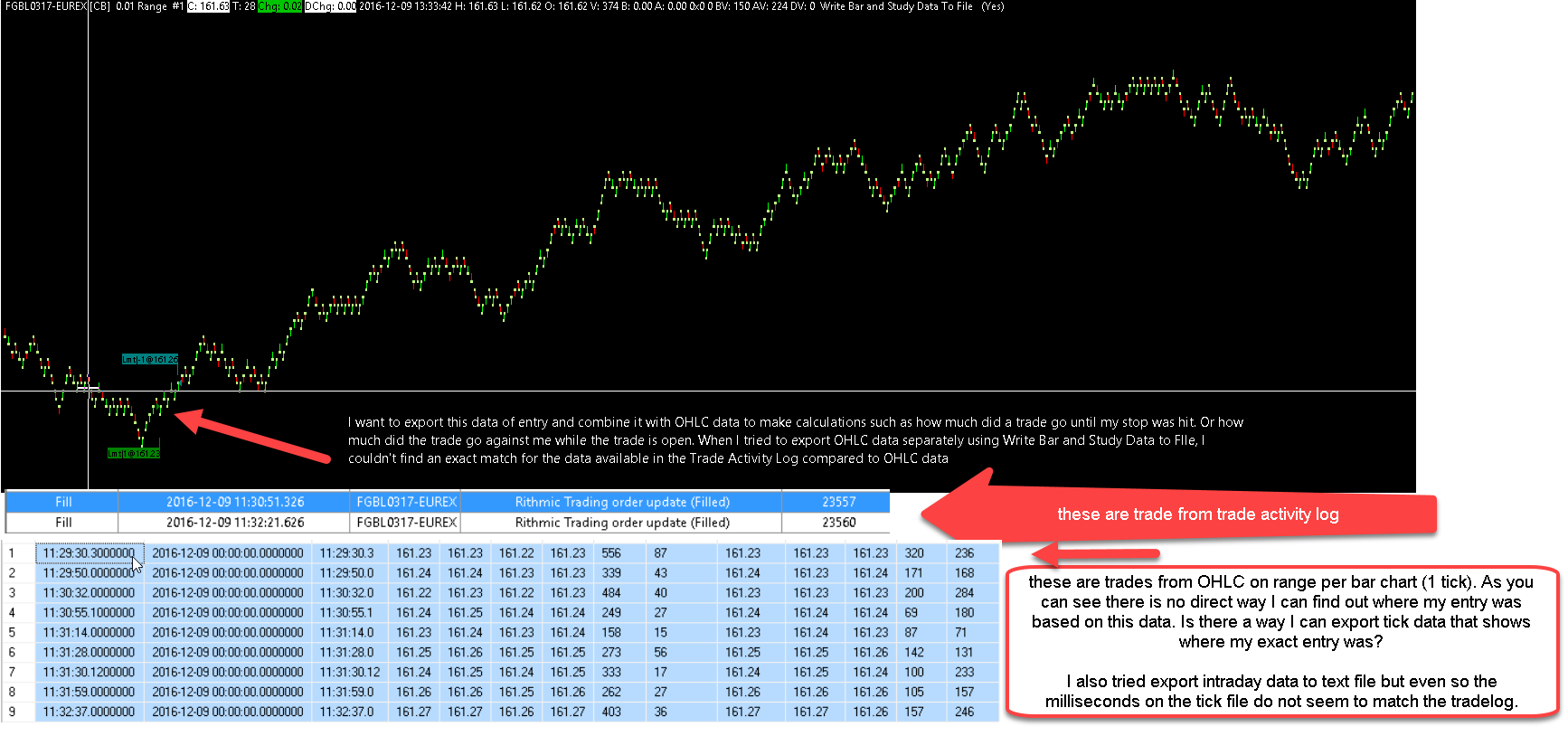 Just to make my question more clear I am giving an example on the attached image. Kindly go through it and let me know if I am clear. To answer the question I was referring to earlier regarding trade entry time - I noticed that on trade activity log -> trade activity tab, the fills are shown in millisecond format however, on the trade activity log -> trades tab, the fills the entry time is not shown in milliseconds. What I am looking for is an accurate way to export tick data and see where exactly my fill was in order to analyse the data. Is there a study to show this that could be exported with the OHLC data? I also tried to export intraday data to text file but even so the milliseconds on the tick file do not seem to match the tradelog. The milliseconds on the intraday text file only has 1 decimal place - it does not show the milliseconds accurately to 3 decimal places. I hope I have been more clear now. UPDATE: I noticed that you do provide some trading studies like Trading: Position, and Total Trades which could help me up with my analysis. I am now using a Range Per Bar - New Bar on Range Chart instead of what I referred to in the attached image. My problem at the moment is that I haven't found a study that shows information displayed in my 2nd attachment, e.g, the entry price and exit price, order id for the full trade from open to close). If I could get this info, I would not require to load any data from the trading log and try to match it with executions. This does not seem the correct way to do this if the chart already has access to this data. Is there a way I could have this data exported in a study? Is there some kind of direct reference on a chart study to an order id then I could accurately back reference any information in the trade log accurately for journal purposes? I also noticed that there is no indicator that groups a trade from open to flat irrespective of scaling in or out. i.e. if you enter with 10 and exit 5 and 5, those would be considered 2 different trades. Is there a way I can have a binary indicator when trade was open and when it was flat again to be considered as 1 trade rather than 2 separate trades? I went to the extent of looking into ACS_Source to see if I could find the source of Position Quantity and Total Trades studies to see if there is something I could try to figure out however I could not locate them. Are they not accessible? Your reply is very much appreciated. Date Time Of Last Edit: 2016-12-11 21:55:23