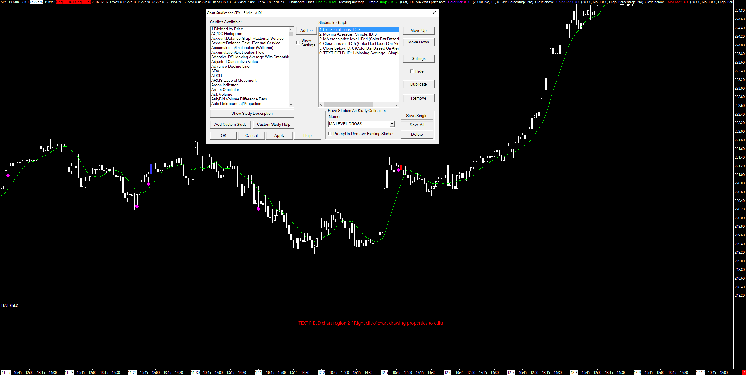 The text field requirement is not clear. If you just want to just edit text in chart region 2 then you could just add a study to that region( set to ignore), and then select the text tool in that region. Your general requirements seem basic to setup and could be created using simple alerts- http://www.sierrachart.com/index.php?page=doc/StudyChartAlertsAndScanning.php - the "Horizontal lines study" would control the price level, which you would manually input using "Line1 Value" - The moving average crossing the price level/ and the next bar closing above/below a price level would be set up using "ColorBarBasedOnAlaertConidtion" Please find example chart book attached> Add this to your SC data folder, then apply to a chart- http://www.sierrachart.com/index.php?page=doc/StudyCollections.html#Applying (updated link for accuracy) -When your moving average crosses and closes above price level a pink dot will paint below the bar(ID4), and an alert will sound. -If the next bar closes above (ID4) a blue bar will paint -If the next bar closes below (ID4) a red bar will paint *You can customize the moving average and price level to anything you want. *Visual/ audible alerts can be configured in the setting for each "ColorBarBasedOnAlaertConidtion" study. Date Time Of Last Edit: 2016-12-12 21:45:49