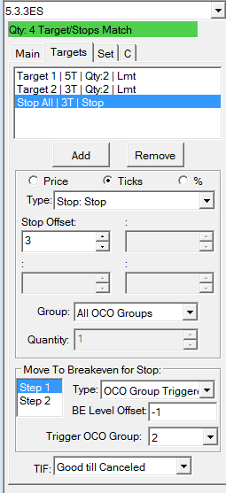 Hello I am trying to do this. Market order triggered with even number of contracts like 2 contracts 2 contracts get an initial stoploss of 3 ticks. For profit target I set one contract for 3 ticks and another contract for 5 ticks As soon as 3 ticks profit target get filled I move initial stoploss to 1 tick from 3 ticks Am I doing it right? I did it as screenshot, but I am getting this message everything my 3 ticks profit target get filled Order modification failed | The order was in a state that cannot be modified. Internal Order ID: 58711. Service Order ID: 495557380. Symbol: F.US.EPH17 | 2016-12-13 08:52:07 * Let me know what I did wrong Thanks in advance |
