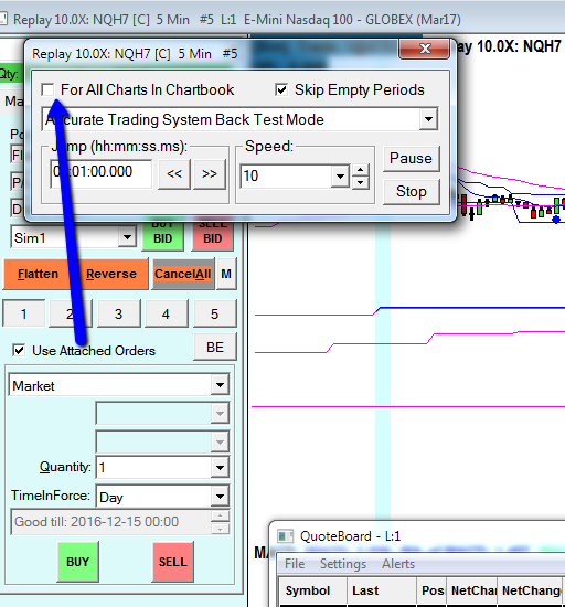 OK, but this is where I run into the problem. The only way I can see to do this is to bring up the reply control panel from the chart menu first, as shown in attachment 1234. So I do that and check the box. Then I choose the replay backtest option from the Trade menu (image 12345 attached). Then I see the clear replay/backtest data prompt (image 123456 attached) and say Yes. Then the backtest begins, the app gets busy, but the "for all charts in chartbook" check box automatically unchecks itself. (image 1234567 attached). So that is where I am stuck. Thank you. |