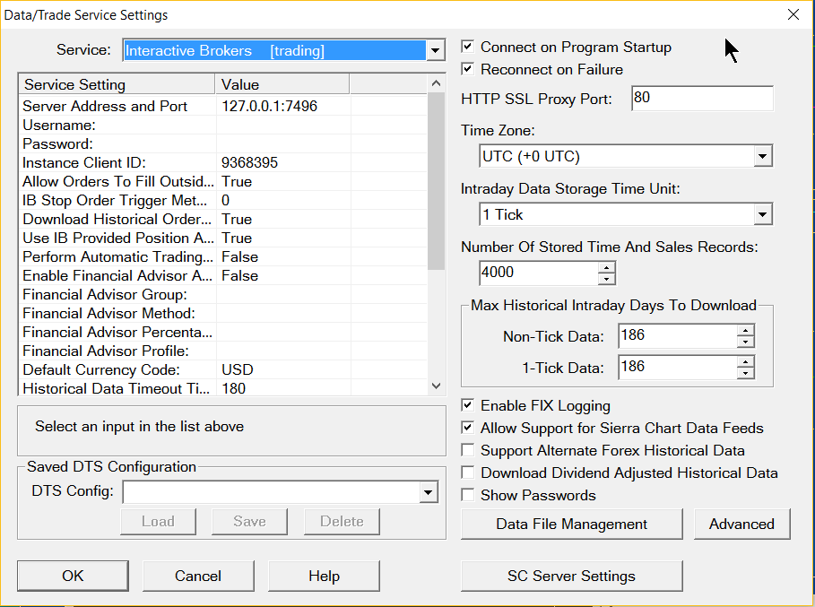 Hi, after opening SC today (after having logged into my LIVE Interactive Brokers acct), all my charts (NQ, YM, ES) were drawn till Dec. 30, 15:58. OK, I discovered that my service balance was insufficient so I: - funded my SC account - (re)activated "Real-time Data Connections" - (re)activated exchanges No change, no data. - IB connectivity status OK - SC Data/Trade service settings correct (no change anyway - it has been working all the time) I do not know what/where to check anymore... Please... P.S. Attached all screenshots |