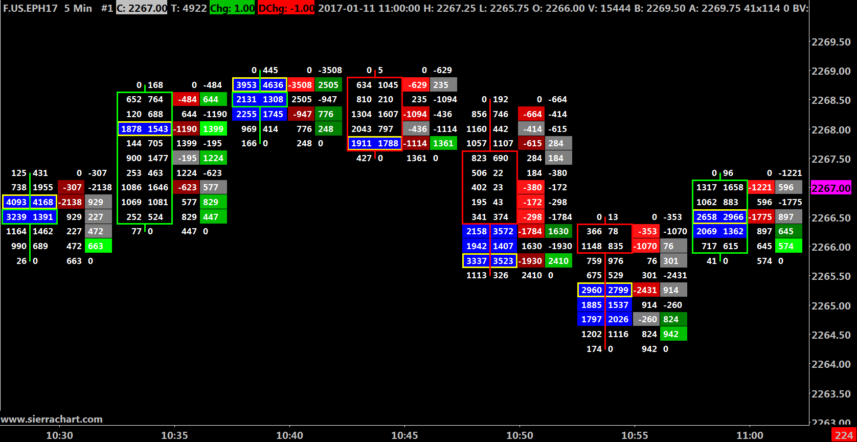 Thank you. Glad you liked it. But I think the Sierra Charts team deserves the credit. THEY are awesome!! Yes, the POC is highlighted in yellow. For the volume, just choose color the background based on volume percentage and then input whatever 3 whole numbers you prefer, such as "500, 1000, 2000" in place of the default decimals (.25, .50, .75). In the example below I chose to highlight any price level with a total volume of at least 3000: http://www.sierrachart.com/image.php?Image=148418765846.png Have fun! |