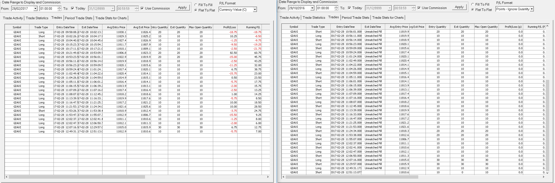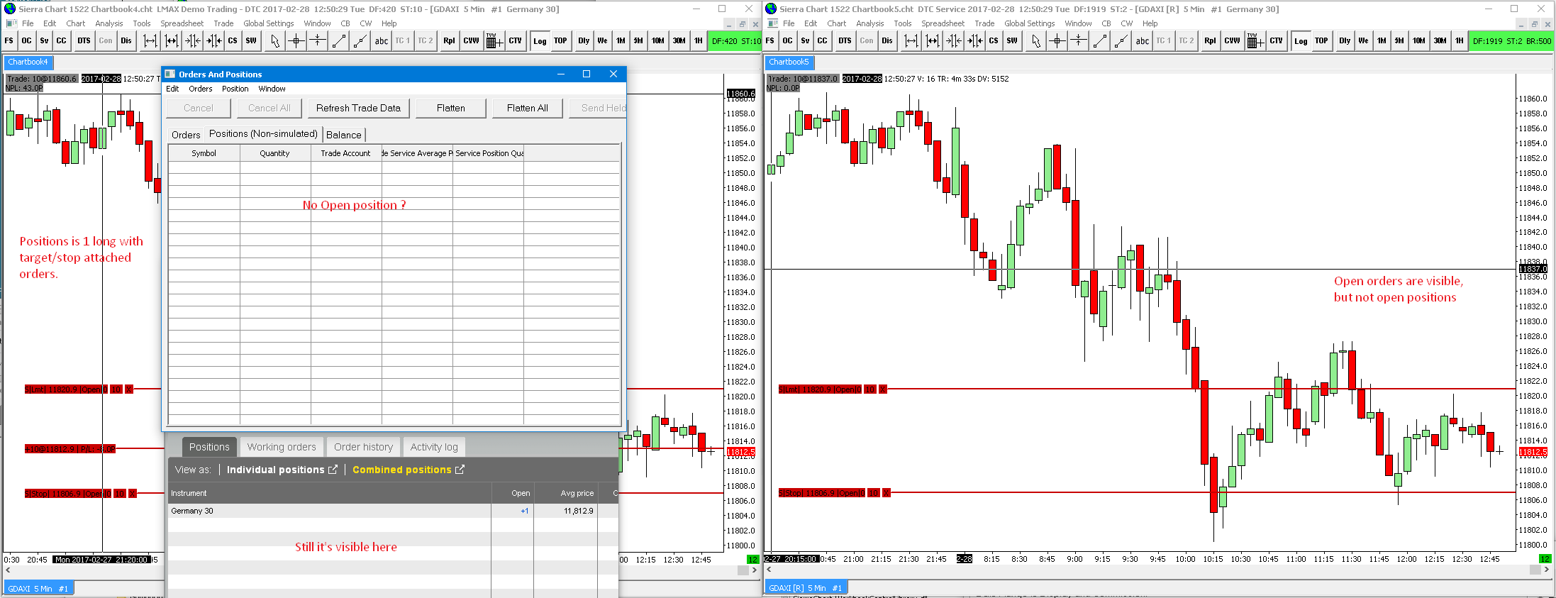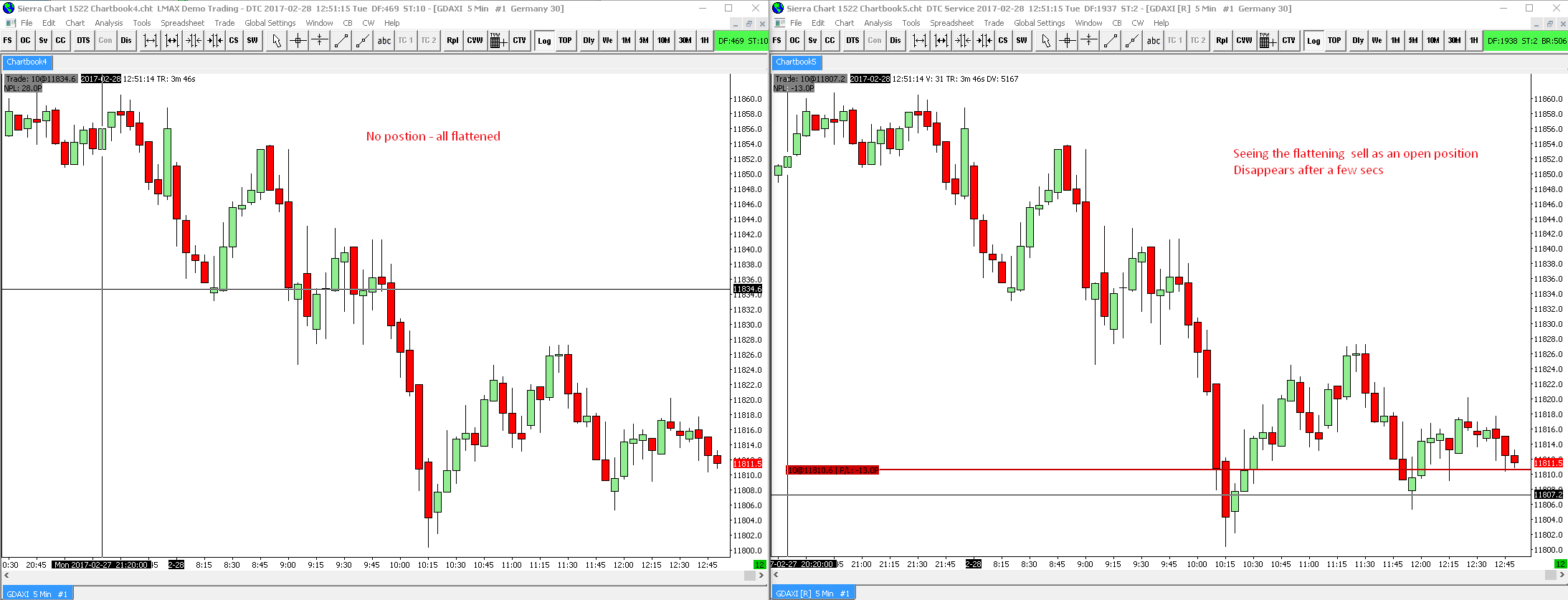 After a couple a tests is seems some parts of the trading historical activity is not handled well. On all the following pics, sierra on the left is directly connected to the LMAX DTC, sierra on the right is connnect to the other sierra. 1. On connection, the "client" sierra does not receive the open positions. I also checked that after sending a CURRENT_POSITIONS_REQUEST to the "server" sierra, it appears the opened positions are not sent back. This may be caused by the fact that even on the "server" sierra which is directly connected to the LMAX DTC, the open positions do not appear, even if there is a position running in sierra, that can be seen on the LMAX web site. (check dtc1 pic) 2. As a consequence, if the position is closed on the sierra "server", an opposite position appears on the client, and stays there for a couple seconds before being cancelled (check dtc2 pic) 3. On the "client" sierra, historical fills are unmatched between buy and sells, so the client is unable to build the current and daily PnL. (check dtc3 pic) Maybe The DTC server in sierra hasn't been build to provide full trading capabilities, just wondering what's expected to work and what isn't. |