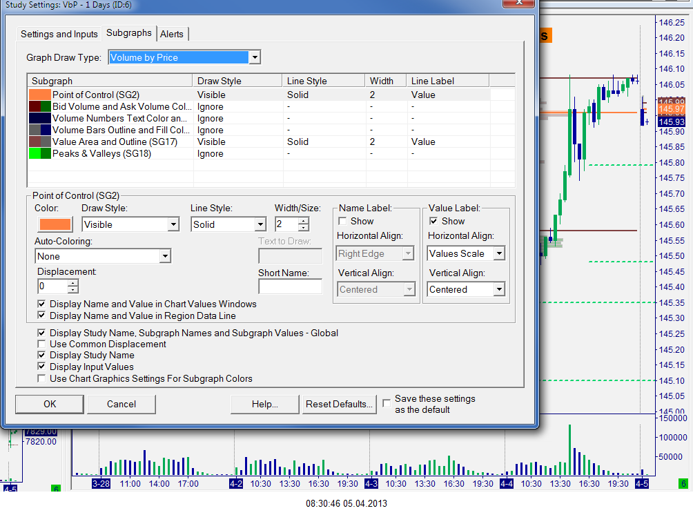 Here are my settings. I display PoC and Value Area Values (High and Low). Hard to see in the screen shot because they overlap right now. What version do you use? I use 954.