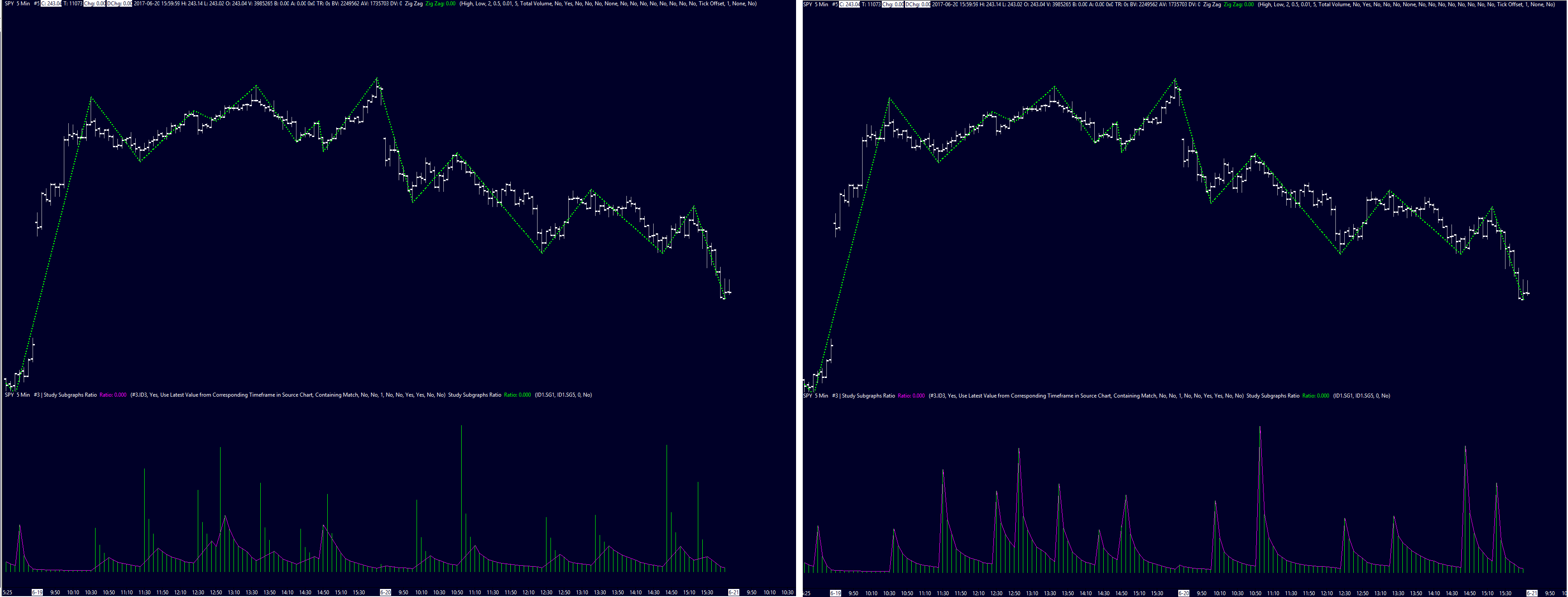 Sorry, I should have been more specific. The real issue is when referencing ZZ subgraphs. For example, using an Arithmetic( subgraph ratio): Zig Zag(SG1)/ Accumulated Volume(SG5) Correct values will not print in real-time. You must re-apply the study or recalculate. See image attached, historical( green)/ realtime( pink), and on the right is after the study is reloaded. -The same issue occurs whenever you reference any of the Zig Zag subgraphs -I'm trying to build real-time alerts from Zigzag subgraphs, so having to manually reload/ recalculate is not a practical solution. So I am asking if you can link to any ACSIL documentation on how I could programmatically execute a study reload/ recalculation. |
