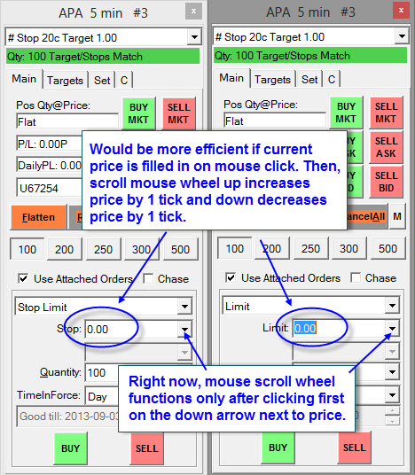 It would be much more efficient if the current price is automatically filled in on the stop and limit prices on the trade window when the mouse is left-clicked on the price field (see attached). Right now, I left-click on the price field and has to manually enter the price before I can submit my order. This process takes longer and I have missed out on some trades because price moved already before I could finish entering the price. I use stop limit and limit orders only when entering a trade. I use the trade window because I feel more comfortable with it than the DOM. I feel like I could easily make a mistake with the DOM. I hope this feature is not difficult to add. Thanks. |