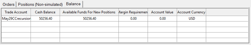 Today while trading my june account completely disappeared while I was trading on it. I have two accounts (may, and june) through T4 (via topsteptrader), and the may account appears fine, but the june is not showing up in sierracharts. According to tst, the accounts are both fine, and I am able to connect to both through the T4 web platform. Attached is my message log, which shows that it is getting some information about the account, and a screenshot of my balances page, where the account is not showing up. After closer examination, it appears that the june account may be trying to load invalid symbols, but I cannot understand why? This is a completely fresh installation (for testing this problem) with no charts or watchlists created.. so where is it trying to load those symbols from? ----------- Reading Internal Order ID file. | 2017-06-28 21:08:16 Reading Trade Orders file. | 2017-06-28 21:08:16 Reading Trade Positions file. | 2017-06-28 21:08:16 Listening on UDP port 22903. | 2017-06-28 21:08:16 Software version: 1568 | 2017-06-28 21:08:16 Uses New Spreadsheets | 2017-06-28 21:08:16 Usage end date: 2017-07-22 | 2017-06-28 21:08:16 Enabled for: Advanced Features. | 2017-06-28 21:08:16 Enabled for: Advanced Features 2. | 2017-06-28 21:08:16 Enabled for: Sierra Chart Historical Data Service. | 2017-06-28 21:08:16 Allow Support for Sierra Chart Data Feeds is enabled. | 2017-06-28 21:08:16 Current selected Data/Trading service: SC Data - All Services | 2017-06-28 21:08:16 Chart Update Interval: 500 | 2017-06-28 21:08:16 Time Zone: +00:00:00 (UTC+00) | 2017-06-28 21:08:16 2017-06-28 17:08:27 Local computer time | 2017-06-28 21:08:16 2017-06-28 21:08:27 Local computer time in UTC | 2017-06-28 21:08:16 2017-06-28 21:08:27 Local computer time in SC Time Zone | 2017-06-28 21:08:16 2017-06-28 21:08:28 Server time in UTC | 2017-06-28 21:08:16 Local computer UTC time and Server UTC time difference: 1 seconds. | 2017-06-28 21:08:16 Program path: C:\SierraChartXXX\ | 2017-06-28 21:08:16 Data Files path: C:\SierraChartXXX\Data\ | 2017-06-28 21:08:16 OS Version Number: 6.2 | 2017-06-28 21:08:16 Locale Setting: C | 2017-06-28 21:08:16 Checking for new symbol settings for service code scdataallservices | 2017-06-28 21:08:16 HTTPS connection to www.sierrachart.com:443 (3) | Creating socket. Using TLS 1.2. | 2017-06-28 21:08:16 HTTPS connection to www.sierrachart.com:443 (3) | Connecting to IP: 204.15.192.108. | 2017-06-28 21:08:16 Requesting symbol settings for service code scdataallservices. Overwrite = on. | 2017-06-28 21:08:31 SC Data - All Services | Connected to data server. | 2017-06-28 21:08:32 Symbol settings received. | 2017-06-28 21:08:34 Processed 5498 symbol settings. | 2017-06-28 21:08:34 It is recommended to reconnect to the data feed after processing symbol settings. Use 'File >> Disconnect' and 'File >> Connect to Data Feed' | 2017-06-28 21:08:34 HTTPS connection to www.sierrachart.com:443 (3) | Socket gracefully closed by remote side. | 2017-06-28 21:08:39 HTTPS connection to www.sierrachart.com:443 (3) | Received socket Close event | 2017-06-28 21:08:39 HTTPS connection to www.sierrachart.com:443 (3) | Initiating close of socket by core. | 2017-06-28 21:08:39 HTTPS connection to www.sierrachart.com:443 (3) | Graceful close received or receive error. Shutdown complete. Closing socket now. | 2017-06-28 21:08:39 HTTPS connection to www.sierrachart.com:443 (3) | Closed. | 2017-06-28 21:08:39 SC Data - All Services | Disconnected. | 2017-06-28 21:09:02 SC Data - All Services | Disconnected. | 2017-06-28 21:09:02 Checking for new symbol settings for service code cts | 2017-06-28 21:09:02 Current selected Data/Trading service: CTS T4 FIX | 2017-06-28 21:09:02 HTTPS connection to www.sierrachart.com:443 (4) | Creating socket. Using TLS 1.2. | 2017-06-28 21:09:02 Will reconnect to the server in 3.0 seconds. Select 'File >> Disconnect' to prevent further connection attempts. | 2017-06-28 21:09:02 HTTPS connection to www.sierrachart.com:443 (4) | Connecting to IP: 204.15.192.108. | 2017-06-28 21:09:02 Requesting symbol settings for service code cts. Overwrite = on. | 2017-06-28 21:09:02 Symbol settings received. | 2017-06-28 21:09:02 Processed 1336 symbol settings. | 2017-06-28 21:09:02 CTS T4 FIX | Connecting to CTS Simulation server fix-sim.t4login.com:10443 | 2017-06-28 21:09:05 CTS T4 FIX | Firm: ptp | 2017-06-28 21:09:05 CTS FIX socket (5) | Creating socket. Using TLS 1.0. | 2017-06-28 21:09:05 CTS FIX socket (5) | Connecting to IP: 74.201.6.199. | 2017-06-28 21:09:05 CTS FIX: Sending the Logon message. | 2017-06-28 21:09:05 CTS T4 FIX | FIX version: 4.3.73.1 | 2017-06-28 21:09:05 CTS T4 FIX | Connected to data and trading server. | 2017-06-28 21:09:05 CTS T4 FIX | Received Account List collateral report. | 2017-06-28 21:09:05 CTS T4 FIX | Subscribing to account: May* | 2017-06-28 21:09:05 CTS T4 FIX | Received Account List collateral report. | 2017-06-28 21:09:05 CTS T4 FIX | Subscribing to account: Jun* | 2017-06-28 21:09:05 Supported exchange: CME_CO (SIM:COMEX Futures) | 2017-06-28 21:09:05 Supported exchange: CME_EqOp (SIM:CME Equity Options) | 2017-06-28 21:09:05 Supported exchange: CME_NYOp (SIM:NYMEX Options) | 2017-06-28 21:09:05 Supported exchange: CME_AgOp (SIM:CME Agricultural Options) | 2017-06-28 21:09:05 Supported exchange: CME_Eq (SIM:CME Equity Futures) | 2017-06-28 21:09:05 Supported exchange: CME_In (SIM:CME Interest Rate Futures) | 2017-06-28 21:09:05 Supported exchange: CME_C (SIM:CBOT Commodity Futures) | 2017-06-28 21:09:05 Supported exchange: CME_KOp (SIM:KCBT Options) | 2017-06-28 21:09:05 Supported exchange: CME_F (SIM:CBOT Financial Futures) | 2017-06-28 21:09:05 Supported exchange: CME_E (SIM:CBOT Equity Futures) | 2017-06-28 21:09:05 Supported exchange: CME_COp (SIM:CBOT Commodity Options) | 2017-06-28 21:09:05 Supported exchange: CME_K (SIM:KCBT Futures) | 2017-06-28 21:09:05 Supported exchange: CME_EOp (SIM:CBOT Equity Options) | 2017-06-28 21:09:05 Supported e