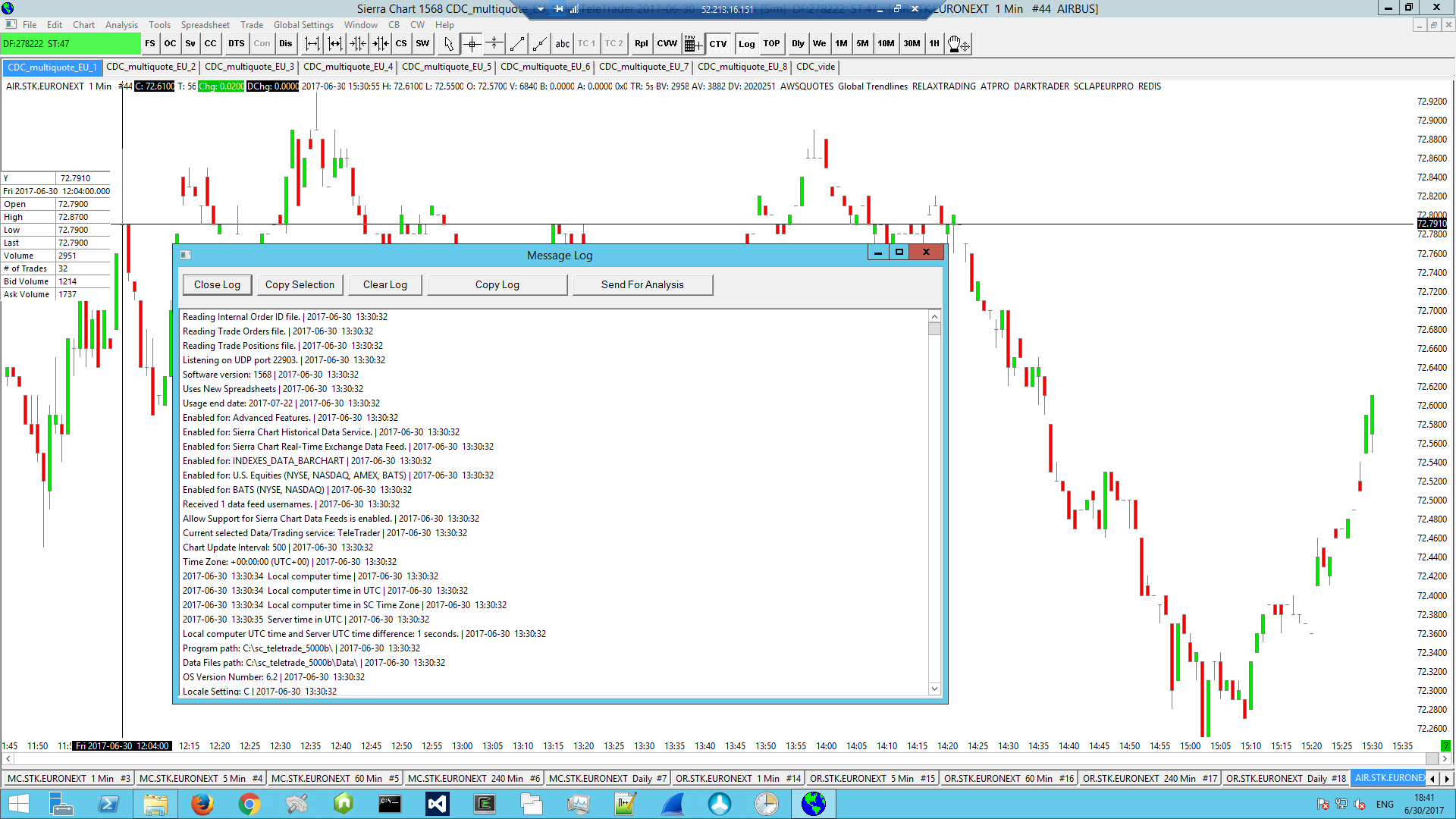 Hi, I have 2 sierra since a few months, one with the Sierra FXCM feed, on with Teletrader. Since a few weeks the teletrader one is not working anymore, this is the situation : - i start sierra, all the charts load up to this time - then they tick (the price change on the right), but the chart itself never get updated - if i restart sierra, the charts are updated, but are still not updating I've already contacted the teletrade support and they confirmed that : - my subscription was still active - nothing is wrong on their end My Sierra software is up to date, could it be a problem with the last version ? Could this be related to this teletrader bridge i read about in your documentation ? Any idea what I could do ? There is no error or anything weird in the message log. Please see a screenshot of this situation. Regards |
