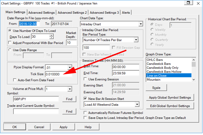 I have read through your help files but do not understand how to configure forex trading correctly. Please give me one example on how to set it to £1 per pip. So I can figure out how to do the rest of the currency crosses myself. GBPJPY I have set: Tick size = 0.01. Currency value per tick = 1 So as I understand it, the above settings should make it £1 per pip. Before I enter a trade, I select quantity = 1. When you look at the screenshot you will see that I got into a trade and the chart showed me 3.00C profit (£3). However, when I close the trade, the software then tells me that my DPL is only 0.03C (£0.03). What is going on? How do I correctly configure SierraChart for forex? |