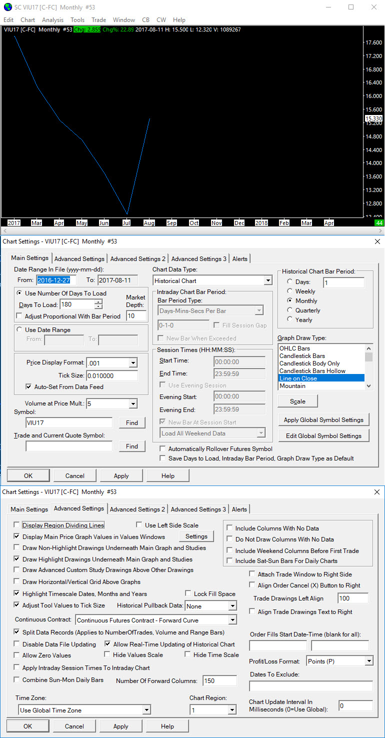 Hello SC, i learned about the possibility to pull up a forward curve in SC just recently and found the documentation about it: Continuous Futures Contract Charts: Forward Curve Charts i tried to pull up a VIX forward curve but failed to do so. What do i do wrong and what do i need to change to pull it up? see my settings in the attached screenshot. fwiw, i tried it with the auto rollover futures setting as well.. still no luck. thanks, Andreas Date Time Of Last Edit: 2017-08-11 09:21:33