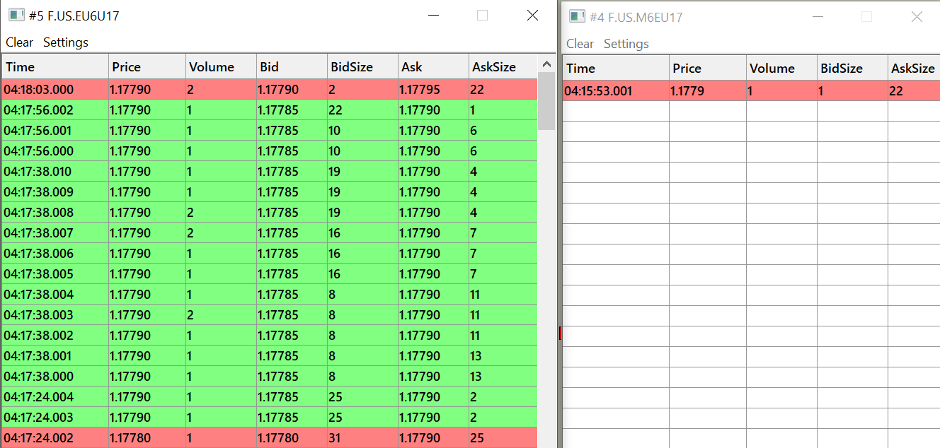 Hi SC Support, This morning I noticed that trades coming in for M6E were being given early time stamps not consistent with simultaneous 6E data that did not have this problem. In fig 1, the single M6E trade occurred at the same time as the 6E trades on the left, but was given a time stamp more than two minutes earlier. In fig 2, a second M6E trade occurred about a minute later, but was time stamped with the same incorrect value. A consequence of these errors is shown in fig 3. Top M6E, Bottom 6E, with “show empty columns” on. The indicated upper M6E trade actually occurred at the time of the lower 6E arrow. It was time stamped to an earlier period and shows up as a premature bar. I have a custom trading study that relies on the synchrony of these two instruments, so this phenomenon messes with its calculations. I have “time stamp using local time” set to false, and use 1 tick data storage unit. My data is through CQG FIX / AMP futures. Thanks in advance if you can figure out why this is happening. |