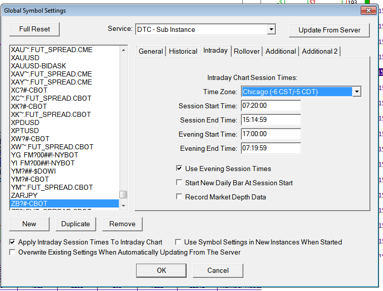 I have a single chart in my instance of SC, and whenever I try to adjust it for my time zone (by "Apply Global Symbol Settings"), I hit apply and it will reload the chart correctly. Once it finishes, then it immediately automatically reloads the chart again and reverts back to CST. I'm stumped, and it only seems to be my two foot print charts. If I open a blank new chart for ZB, then it works fine...I feel like I'm overlooking something. |