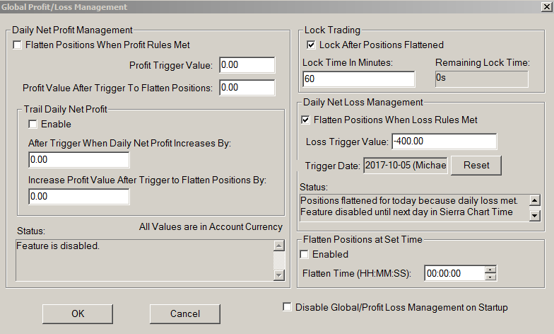 When i hit my daily stop limit with a OCO stop limit bracket on the trade using "Global profit loss management" . My open orders get cancelled but i stay in my position. The trade does not flatten. I have to manually flatten the position through my broker. Then as you can see it still says i am in my position. My question is why does it not flatten me out of my trade? It only takes away the open oco orders. This basically makes "global profit loss management" tool useless. Is there a way it can actually flatten my trade as well? |