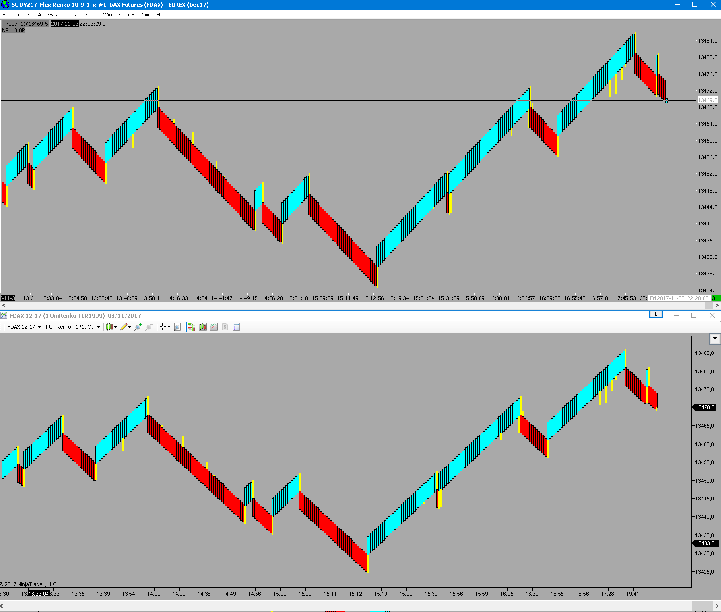 Just for the record here is the SC 10-9-1-x chart vs the NT UniRenko T1R19O9 See how they match perfectly to the tick This is what was awesome with the old Flex Renko with 'New bar when exceeded' |
