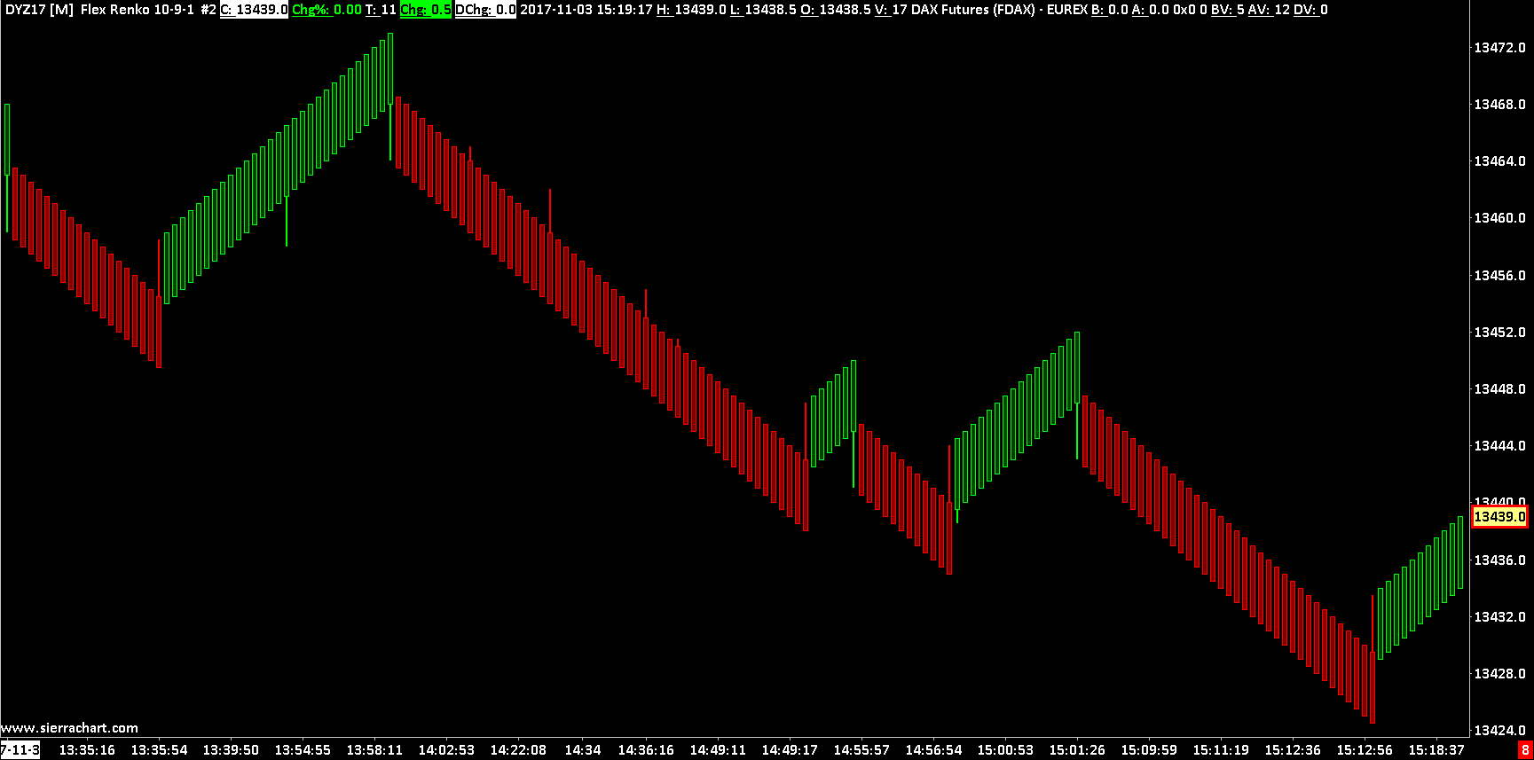 Taking that functionality out, this is what we see: http://www.sierrachart.com/image.php?Image=1509939583695.png We will add an option to for that. We also need to add an option, which will start a new Renko bar when the new bar range has been met and not exceeded. We have added this to the code now and this is what we see: http://www.sierrachart.com/image.php?Image=1509940478496.png The images you are looking at in the documentation are still old. And not updated. Moreover, it seems that most consective bars are 1 tick apart, but some are 2 or 3 ticks apart(pink rectangle), and some 0.5 tick apart(yellow rectangle) This is handled just by filling the gaps using one of the options here:Renko Bar Charts: Filling of Price Gaps with Renko Bars The chart images provided in this post, do use Fill All Bar Gaps. At this point just wait for the new options. So as you can see, with the addition of just simply single-line if statements, we can modify the behavior easily. The new code is very well structured. The fact is that you did a massive functional change here with no warning, Finally this really is not a fair statement. To say there is a massive functional change, is completely inconsistent with actual fact. Some change yes, and we can see now that some of the change, were subtle details that we were not aware of. The Renko related development has already been announced on the What is New webpage: https://www.sierrachart.com/index.php?page=doc/Whats_New.php Also when you see the interface for how to build chart bars, which is still not done, we need about another two days on this, you will see just how easy it is. Sierra Chart Support - Engineering Level Your definitive source for support. Other responses are from users. Try to keep your questions brief and to the point. Be aware of support policy: https://www.sierrachart.com/index.php?l=PostingInformation.php#GeneralInformation For the most reliable, advanced, and zero cost futures order routing, *change* to the Teton service: Sierra Chart Teton Futures Order Routing Date Time Of Last Edit: 2017-11-06 04:06:33