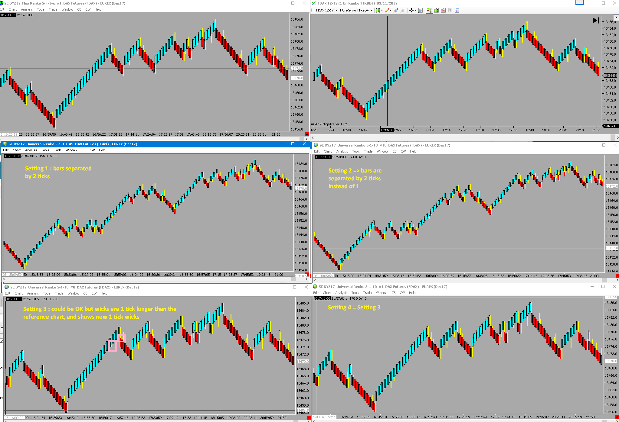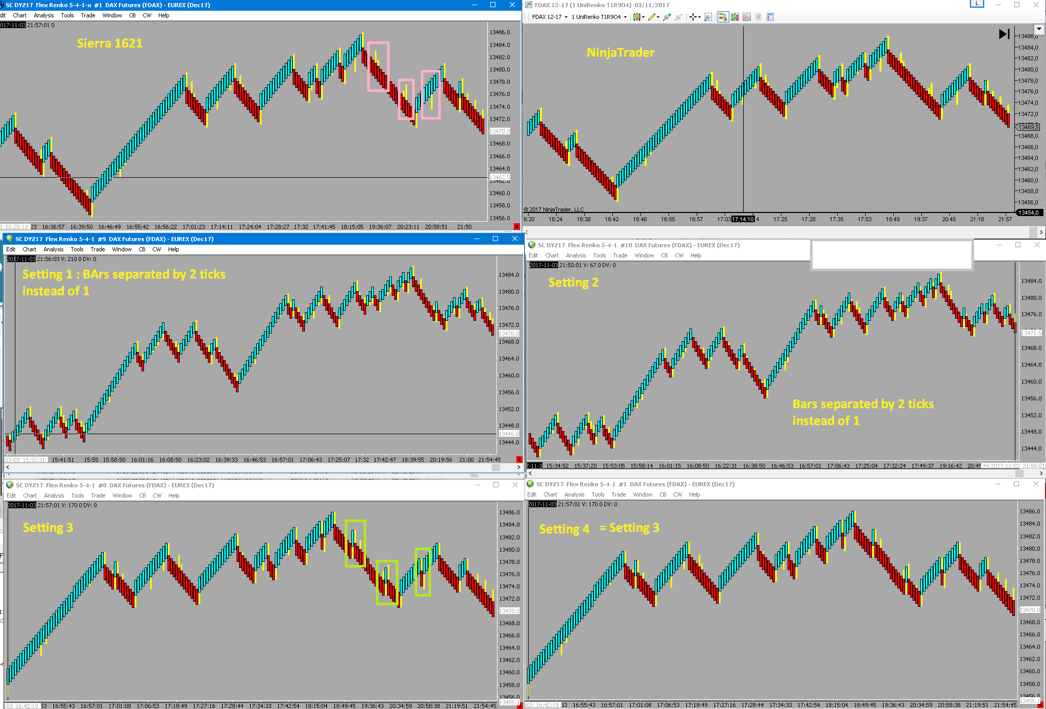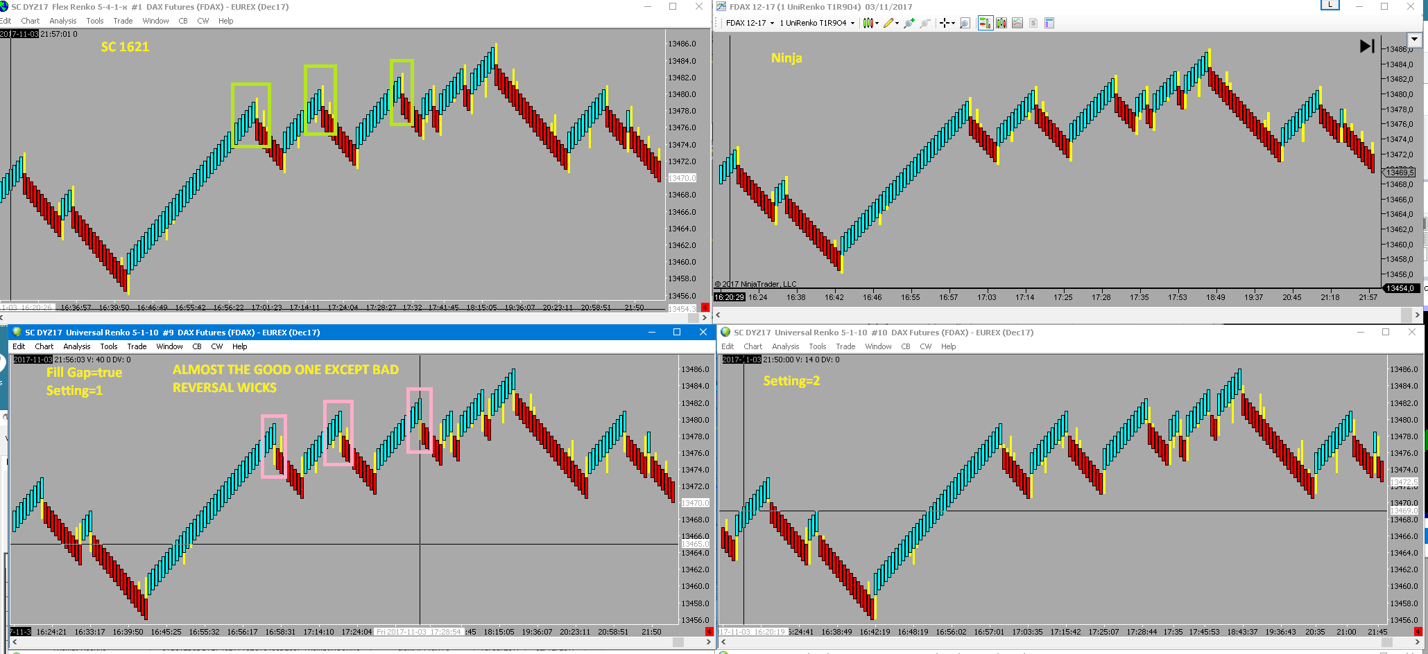 ok here are a couple tests Reference chart is SC 1621 5-4-1-x chart, along with NinjaTrader chart (they match perfectly) These charts are the 2 on the top. 1. FlexRenko 5-4-1 (Fill Off) *In exceeded mode, consecutive bars are separated by 2 ticks instead of 1 *In the other mode, separation is OK but I get a reversal (green rectangle) instead of reference wick (pink rectangle) 2. Universal Renko 5-1-10 (Fill Off) * In exceeded mode, same as flex renko : bars separated by 2 ticks * In the other mode, the chart is nearly ok, but the wicks are all 1 tick longer than the reference chart, and exhibit some new 1 tick wicks(pink rectangles) 3. Universal Renko 5-1-10 (Fill On) * Exceeded mode now repaired. Setting 1 could be the one if the reversal wicks were on the other side (green vs pink rectangles) So it seems we are making progress, not there yet, but close ! |