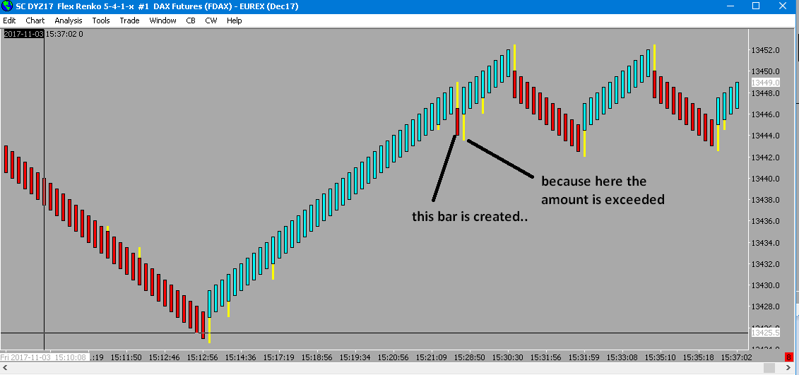 In the 1621 5-4-1-x (new bar when exceeded), the green candle can not be created, because it doesn't exceed the reversal amount. So you get a down wick. I'm attaching a small chart. No detail. |