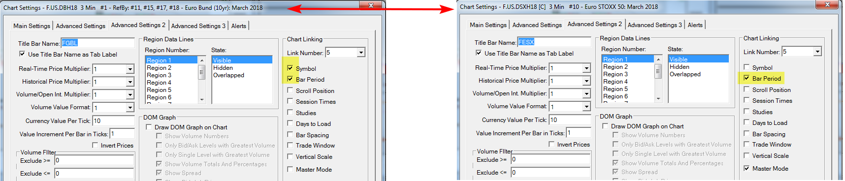 See pic. Should work. FGBL is linked with other charts by Symbol (ABCD) and additional by Bar Period FESX (your E) has the same LINK Number and is linked by Bar Period. There is also "Master Mode" but I don't know if it is really necessary |