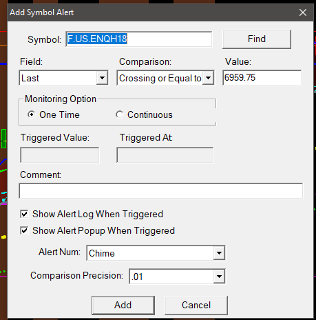 You can quickly do this from the Add Symbol Alert tool. This is found under Window/Alert Manager/Symbol Alerts (Tab)/Add Symbol Alert. Your alert choices are available in the selection window (see below). To make this faster and actually useful, add the Add Symbol Alert to your Chart shortcut menu via Global Settings/Customize Chart Shortcut Menu and you can select it via right click right on your chart. Your price will be the point you clicked your mouse for the alert. Here's a link to the SC Documentation --> Alerts Manager: Symbol Alerts Scott Edit - Sorry I should have watched your video first. My method doesn't give you the moveable line after it's set. You can adjust it but it's not as simple as what you were doing in NT and what SC Support showed below. Date Time Of Last Edit: 2018-01-25 21:16:07