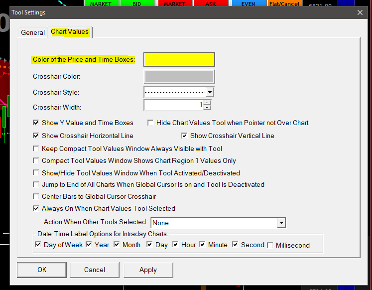 Use the Chart Value Tool with Crosshairs. This will highlight the cursor price and time to the color of your choice AND overwrite the last price when the cursor price is partially obscuring it. Change these settings at Global Settings/Tool Settings/Chart Values. In my first post below you can see the current price is 6803.50 in white and red and the cursor price is displayed in Yellow at 6799.00 The link for the Chart Value Tools settings is here --> Chart Drawing Tools: Chart Values/Crosshair |