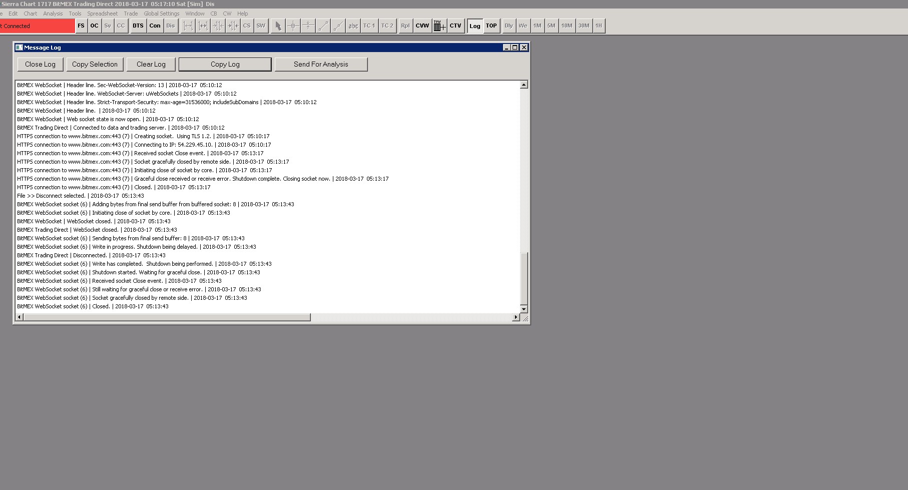 I made bold the line you are reading, the last line of the log according to the above post. Everything that occurs after that in the log is what happens next. This happens every time. I have not been able to connect to Bitmex once yet. Reading Internal Order ID file. | 2018-03-17 05:09:31 Reading Trade Orders file. | 2018-03-17 05:09:31 Reading Trade Positions file. | 2018-03-17 05:09:31 Listening on UDP port 22904. | 2018-03-17 05:09:31 Software version: 1717 64-bit | 2018-03-17 05:09:31 Usage end date: 2018-03-31 | 2018-03-17 05:09:31 Enabled for: Advanced Features. | 2018-03-17 05:09:31 Enabled for: Advanced Features 2. | 2018-03-17 05:09:31 Enabled for: Sierra Chart Historical Data Service. | 2018-03-17 05:09:31 Allow Support for Sierra Chart Data Feeds is enabled. | 2018-03-17 05:09:31 Current selected Data/Trading service: BitMEX Trading Direct | 2018-03-17 05:09:31 Chart Update Interval: 500 | 2018-03-17 05:09:31 Time Zone: +00:00:00 (UTC+00) | 2018-03-17 05:09:31 2018-03-16 22:09:31 Local computer time | 2018-03-17 05:09:31 2018-03-17 05:09:31 Local computer time in UTC | 2018-03-17 05:09:31 2018-03-17 05:09:31 Local computer time in SC Time Zone | 2018-03-17 05:09:31 2018-03-17 05:09:51 Server time in UTC | 2018-03-17 05:09:31 Local computer UTC time and Server UTC time difference: 21 seconds. | 2018-03-17 05:09:31 Program path: C:\SierraChart\ | 2018-03-17 05:09:31 Data Files path: C:\SierraChart\Data\ | 2018-03-17 05:09:31 OS Version Number: 6.1 | 2018-03-17 05:09:31 Locale Setting: C | 2018-03-17 05:09:31 Checking for new symbol settings for service code bitmex.dtc.trading | 2018-03-17 05:09:31 HTTPS connection to www.sierrachart.com:443 (4) | Creating socket. Using TLS 1.2. | 2018-03-17 05:09:31 HTTPS connection to www.sierrachart.com:443 (4) | Connecting to IP: 204.15.192.108. | 2018-03-17 05:09:31 Symbol settings are up-to-date for bitmex.dtc.trading | 2018-03-17 05:09:32 Received 5 login tokens. | 2018-03-17 05:09:32 BitMEX Trading Direct | Connecting to URI www.bitmex.com/realtime/WebSocket | 2018-03-17 05:09:35 BitMEX WebSocket | Connecting to WebSocket server. | 2018-03-17 05:09:35 BitMEX WebSocket socket (5) | Creating socket. Using TLS 1.2. | 2018-03-17 05:09:35 BitMEX WebSocket socket (5) | Connecting to IP: 54.229.45.10. | 2018-03-17 05:09:35 BitMEX WebSocket | Opening WebSocket. | 2018-03-17 05:09:35 BitMEX WebSocket | Sending WebSocket handshake. | 2018-03-17 05:09:35 BitMEX WebSocket | Header line. HTTP/1.1 101 Switching Protocols | 2018-03-17 05:09:36 BitMEX WebSocket | Header line. Date: Sat, 17 Mar 2018 05:09:56 GMT | 2018-03-17 05:09:36 BitMEX WebSocket | Header line. Connection: upgrade | 2018-03-17 05:09:36 BitMEX WebSocket | Header line. Set-Cookie: AWSALB=10bdMo9zzjJN5sgiOSidT0URUJ0NWmD5xPA+clyhmw1bY8yIi8wGu2/qTjtqDcZzWk3lifw44OkLfs0R3U6jqO+pGA2DI5VqeICiYvgI9+wndl+8PnVDTBVWITDd; Expires=Sat, 24 Mar 2018 05:09:56 GMT; Path=/ | 2018-03-17 05:09:36 BitMEX WebSocket | Header line. Upgrade: websocket | 2018-03-17 05:09:36 BitMEX WebSocket | Header line. Sec-WebSocket-Accept: cqJUc1O3zYTNwWGR+UKbjwvArfg= | 2018-03-17 05:09:36 BitMEX WebSocket | Header line. Sec-WebSocket-Version: 13 | 2018-03-17 05:09:36 BitMEX WebSocket | Header line. WebSocket-Server: uWebSockets | 2018-03-17 05:09:36 BitMEX WebSocket | Header line. Strict-Transport-Security: max-age=31536000; includeSubDomains | 2018-03-17 05:09:36 BitMEX WebSocket | Header line. | 2018-03-17 05:09:36 BitMEX WebSocket | Web socket state is now open. | 2018-03-17 05:09:36 BitMEX Trading Direct | Connected to data and trading server. | 2018-03-17 05:09:36 BitMEX WebSocket socket (5) | Received socket Close event. | 2018-03-17 05:09:36 BitMEX WebSocket socket (5) | Socket gracefully closed by remote side. | 2018-03-17 05:09:36 BitMEX WebSocket socket (5) | 2 bytes remaining in receive buffer when socket closed. | 2018-03-17 05:09:36 BitMEX WebSocket socket (5) | Initiating close of socket by core. | 2018-03-17 05:09:36 BitMEX WebSocket | Network socket for WebSocket has been closed by remote side. | 2018-03-17 05:09:36 BitMEX Trading Direct | WebSocket closed. | 2018-03-17 05:09:36 Connection to the external service has been lost. | 2018-03-17 05:09:36 BitMEX WebSocket socket (5) | Graceful close received or receive error. Shutdown complete. Closing socket now. | 2018-03-17 05:09:36 BitMEX WebSocket socket (5) | Closed. | 2018-03-17 05:09:36 BitMEX Trading Direct | Disconnected. | 2018-03-17 05:09:36 Will reconnect to the server in 3.0 seconds. Select 'File >> Disconnect' to prevent further connection attempts. | 2018-03-17 05:09:36 HTTPS connection to www.sierrachart.com:443 (4) | Socket gracefully closed by remote side. | 2018-03-17 05:09:37 HTTPS connection to www.sierrachart.com:443 (4) | Received socket Close event. | 2018-03-17 05:09:37 HTTPS connection to www.sierrachart.com:443 (4) | Initiating close of socket by core. | 2018-03-17 05:09:37 HTTPS connection to www.sierrachart.com:443 (4) | Graceful close received or receive error. Shutdown complete. Closing socket now. | 2018-03-17 05:09:37 HTTPS connection to www.sierrachart.com:443 (4) | Closed. | 2018-03-17 05:09:37 HTTPS connection to www.sierrachart.com:443 (2) | Socket gracefully closed by remote side. | 2018-03-17 05:09:37 HTTPS connection to www.sierrachart.com:443 (2) | Received socket Close event. | 2018-03-17 05:09:37 HTTPS connection to www.sierrachart.com:443 (2) | Initiating close of socket by core. | 2018-03-17 05:09:37 HTTPS connection to www.sierrachart.com:443 (2) | Graceful close received or receive error. Shutdown complete. Closing socket now. | 2018-03-17 05:09:37 HTTPS connection to www.sierrachart.com:443 (2) | Closed. | 2018-03-17 05:09:37 File >> Disconnect selected. | 2018-03-17 05:09:37 BitMEX Trading Direct | Disconnected. | 2018-03-17 05:09:37 BitMEX Trading Direct | Connecting to URI www.bitmex.com/realtime/WebSocket | 2018-03-17 05:10:12 BitMEX WebSocket | Connecting to WebSocket server. | 2018-03-17 05:10:12 BitMEX WebSo