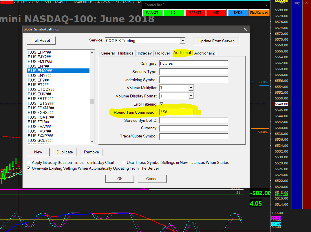Commissions are set in the Global Settings/Symbol Settings/Additional(Tab) menu and are attached to each specific symbol traded. You'll need to enter your round trip costs/contract. I don't think there's a way to enter a percentage (I could be wrong) so if not you may just want to average your typical cost/trade based on your trading behavior. Trade Activity Log: Use Commission Scott |