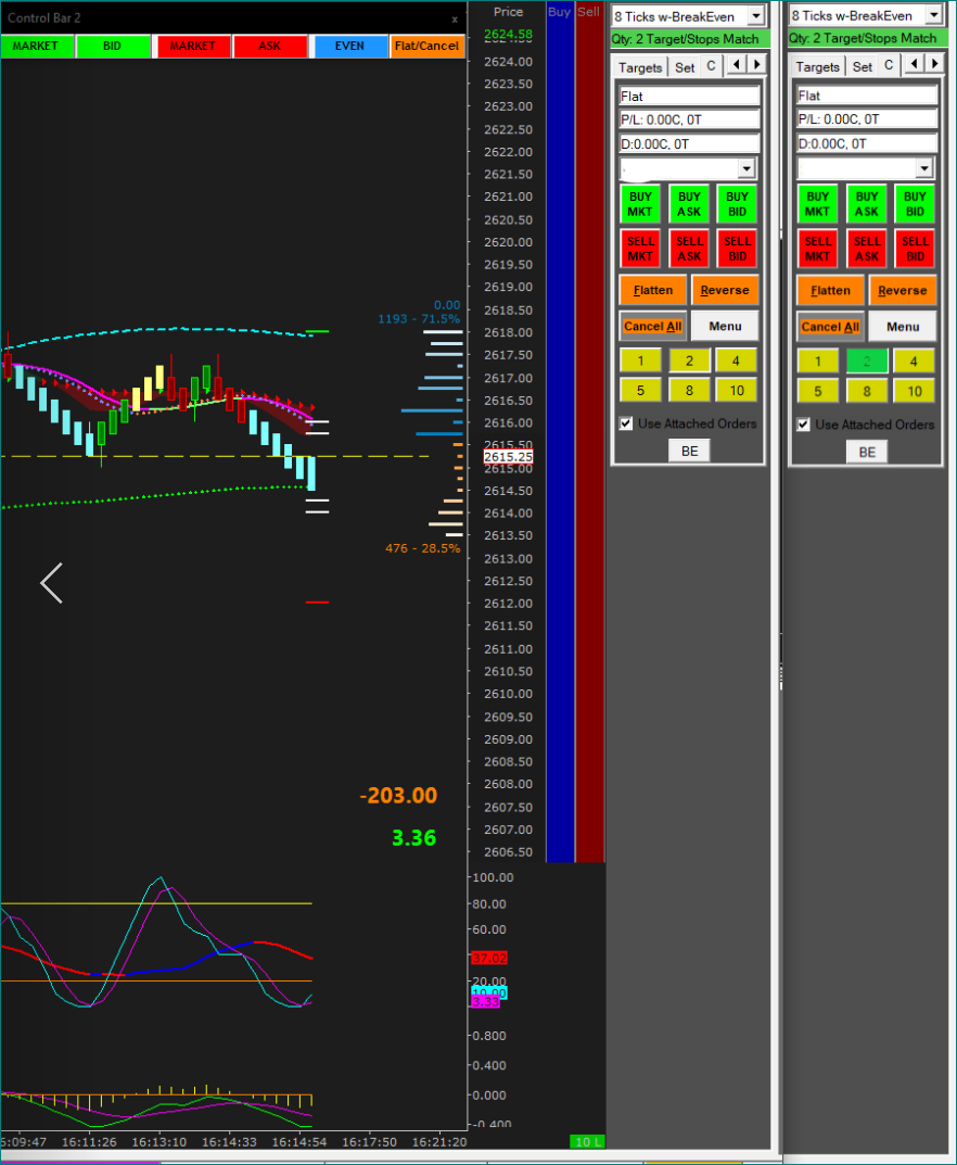I saw another user requested you look at the active state of the chart tabs since when they are linked/colored they do not change and are hard to quickly see which tab belongs to the active chart if you have many charts up (like the unlinked tabs do now) which I thought was a great idea. In a similar vein, I've attached an image of what for me is a frequent issue. When changing number of contracts I will often forget what number of contracts I used last and enter a new position with the wrong number of contracts, only to notice it after I'm in a position. Glancing at the Trade Window does nothing for me as the depressed state of any of these buttons is VERY difficult to easily see. This obviously causes issues for me and in a perfect world I'd ALWAYS check that setting more carefully but during active trading I may not. Allowing the depressed state of the button to be another color would be a great reminder at a quick glance of what settings are currently active and more importantly help prevent potentially expensive trading errors. Thanks for considering this suggestion. Scott Date Time Of Last Edit: 2018-03-27 23:10:16
