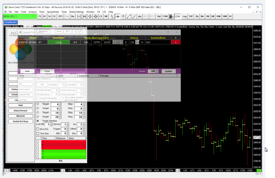Transparent Launch Pad Coming Next Week When using a touch screen to deploy bots, I have noticed that myself, and other traders, like to position the SceetoBots Launch Pad as close to price as possible. A few days ago we published a re-jiggered Launch Pad in order to minimize how far a trader's eye had to flicker away from Price action and over to the Launch Pad in order to tap on thier screen, or move their mouse,to deploy a bot. To furthermore extend the efficiency the Launch Pad's usability, we have completed a prototype of a semi-transparent Launch Pad interface so that a trader can plunk their Launch Pad directly over price. (See attached graphic of prototype) The speed and accuracy with which a trader can now deploy bots by simply tapping on a screen totally changes the model for scalpers - particularly scalpers who incorporate order flow information into their analysis. We are working to complete testing of this functionality this week, and released the functionality to this trading community next week. Very excited, Carl Date Time Of Last Edit: 2018-03-28 19:33:25