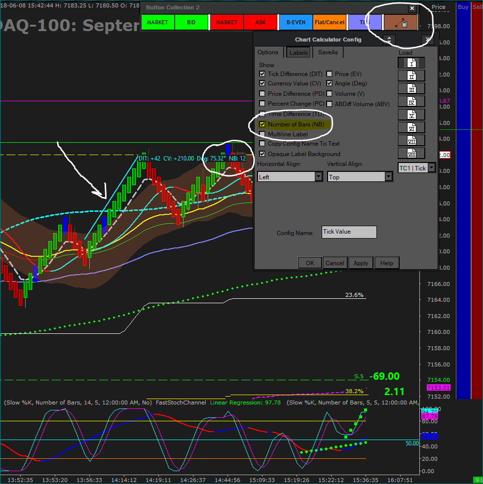If this isn't something you need done automatically all the time, I use the Chart Calculator Tool and turn on the Number of Bars checkbox. I use this tool all the time to calculate profit, Ticks and Number of Bars. It will also leave the information on your chart if you wish after you've drawn point to point. See my attached image if interested. Edit: I see SC Engineering added the same suggestion while I was formulating this reply ;^) -- Scott Date Time Of Last Edit: 2018-06-08 19:45:49