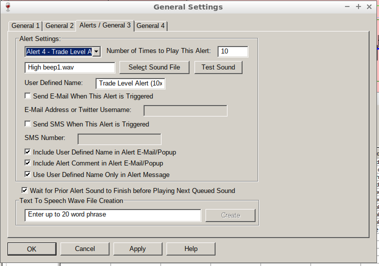 I need an alert sound that will repeat till I switch it off. Kind of like my alarm clock in the morning that sounds till I am awake and switch it off. Today I was at the coffee machine near my desk, an alert went off, I did not hear it, and by the time I got back to my desk the trade opportunity passed. I switched my alert to 10x (see screenshot) but when testing the sound is only played twice. Not 10 times. Not sure why. But is it possible to have an alert keep going and going till someone switch it off within the alert popup? |