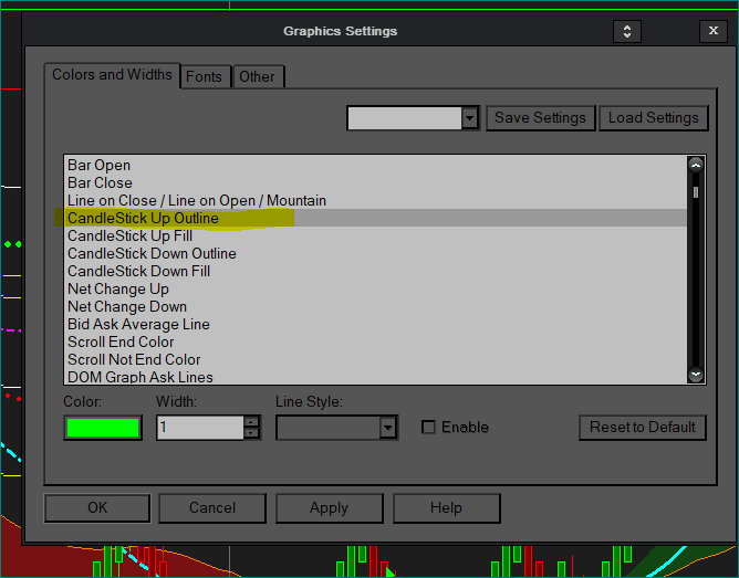 You can change the outline color easily but it will also change the candle border color. You can do that in the Graphics Settings under the Global or Chart menus. -- Scott |