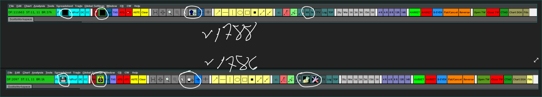 Updated to 1788 this morning to give it a spin. I don't know if you've made the changes you've identified yet in this version but here's what I'm seeing this morning: * My chart graphics appear to be back to normal. * My ToolBar graphics are NOT back to normal (See attached). The buttons I have assigned images to are all blank or have defaulted to the standard text display. Looking at the Property Settings for those impacted shows the correct button image attached but they are not displaying. * Horizontal Lines (and maybe other objects but that's just what I first noticed) I've drawn on the Charts, will not display in anything other than a solid line. My default setting is a dashed line yet when placing a horizontal line it displays as a solid line. Selecting other line types still only displays a solid line on the chart. Lines that I had placed yesterday that were dashed are also now solid. Hope that's of help....Scott |