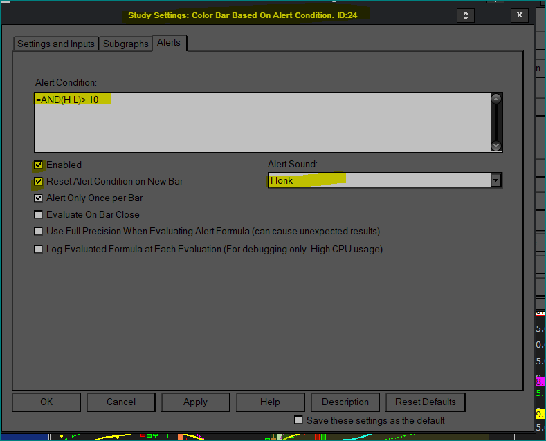 Put this formula into a Color Bar Based on Alert Study and turn on an appropriate sound alert and you'll get an alert whenever the range that you're looking for is exceeded (I used 10 just as an example). You can use other studies too if you want and you can turn off the actual painting of the bars in the Color Bar study if you don't need each bar colored. If you want to be alerted before the range is exceeded just change the number to 1 tick (or whatever you wish) before the bar range is exceeded. =(H-L)>-10 -- Scott |