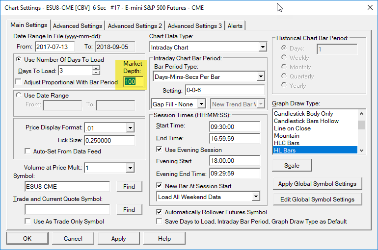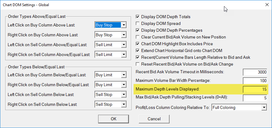 Hello SC, i am a bit confused with the market depth levels settings.. what i want to do is to have on 3 of my 4 domss a number of market depth levels of 15 and on another (chart) dom with a market depth historical graph i want like 50 levels.. though i seem unable to achieve that.. there seems to be 3 settings available but only one setting actually changes soemthing in the number of levels displayed but that setting seems to only work globally.. there's the data/trade service settings, the chart settings and the chart dom settings.. no matter what i have in the trade service or chart settings its only the chart dom settings which change anything.. please advise. |