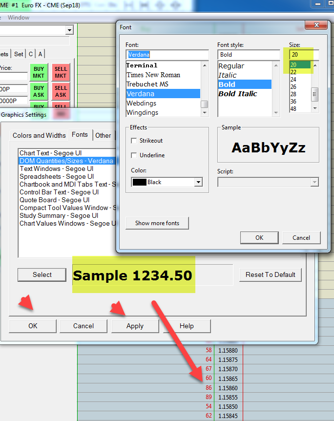 Dear Sierra Customer Service, I am new to this trading software and I am wondering how to deal with the GUI. Using the Graphics Settings: Fonts and Text Appearance I chose DOM Quantities/Sizes , changing the type of font and also the size. Then I pressed Apply and OK but nothing changed. A snapshot is attached. On a side note, also I don't understand how to increase the price column width; only quantity columns widths are easy to manipulate. Thank you. |