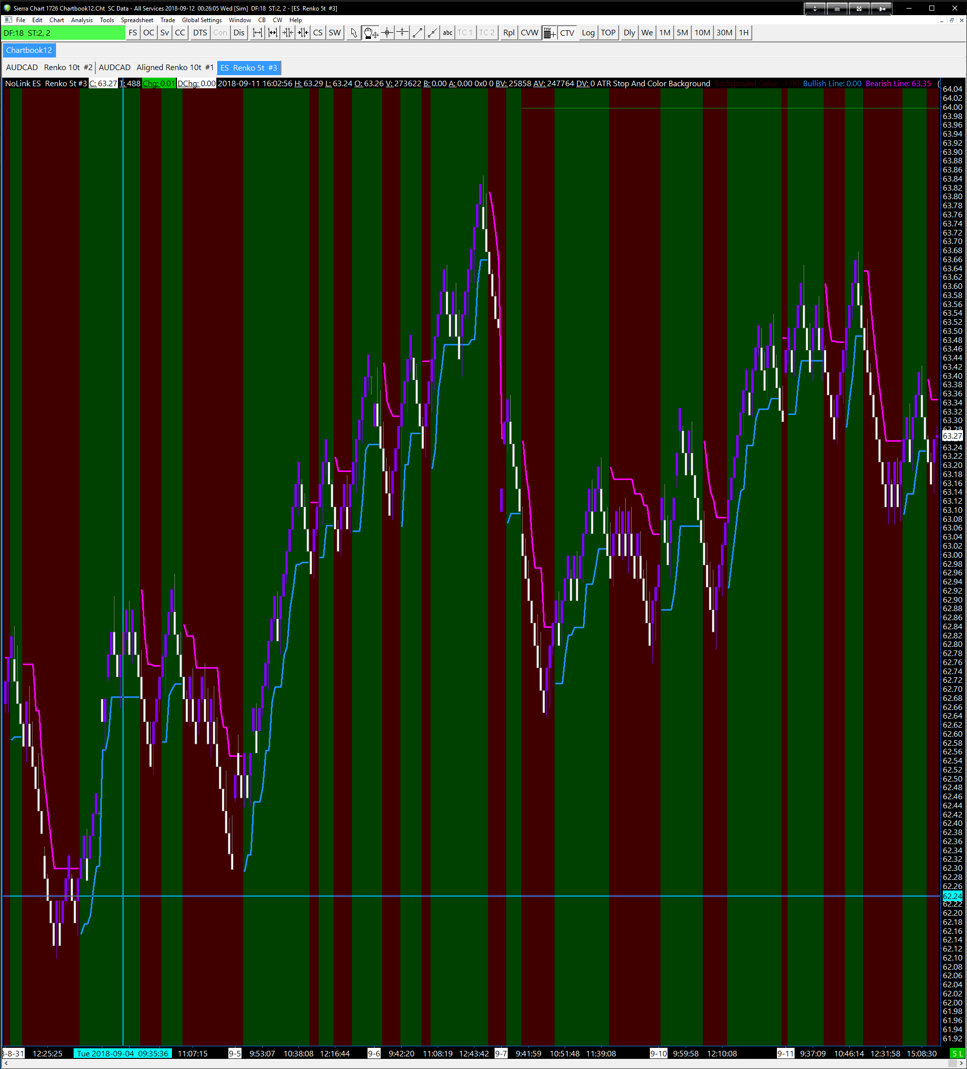 Here's a slightly modified version that doesn't use transparency (saves on performance anyway), you can change that back if you want to but it has to be done from the code. You can change the color from the subgraphs tab, but not the draw style. Choose between Color bars and Color background on the inputs tab. Note that I changed the function name and study name to "ATR Stop And Color Background". I also had to move the BackgroundColor subgraph to 0 so it gets drawn first. Attached is an ES 5 Tick Regular Renko chart with it applied. Try opening a new chartbook and tab and applying the study to rule out local chart graphics. #include "sierrachart.h" SCSFExport scsf_ATRStopAndColorBackground(SCStudyInterfaceRef sc) { SCSubgraphRef BackgroundColor = sc.Subgraph[0]; SCSubgraphRef BullishLine = sc.Subgraph[1]; SCSubgraphRef BearishLine = sc.Subgraph[2]; SCSubgraphRef Trend = sc.Subgraph[3]; SCSubgraphRef BarColor = sc.Subgraph[4]; SCSubgraphRef ATR = sc.Subgraph[5]; SCInputRef TrendLength = sc.Input[0]; SCInputRef Factor = sc.Input[1]; SCInputRef ColorType = sc.Input[2]; if (sc.SetDefaults) { sc.AutoLoop = 1; sc.DrawStudyUnderneathMainPriceGraph = 1; sc.FreeDLL = 0; sc.GraphName = "ATR Stop And Color Background"; sc.GraphRegion = 0; // Graphs BullishLine.Name = "Bullish Line"; BullishLine.DrawStyle = DRAWSTYLE_LINE_SKIP_ZEROS; BullishLine.PrimaryColor = COLOR_DODGERBLUE; BullishLine.LineWidth = 3; BearishLine.Name = "Bearish Line"; BearishLine.DrawStyle = DRAWSTYLE_LINE_SKIP_ZEROS; BearishLine.PrimaryColor = COLOR_MAGENTA; BearishLine.LineWidth = 3; Trend.Name = "Trend"; Trend.DrawStyle = DRAWSTYLE_IGNORE; Trend.SecondaryColorUsed = true; Trend.PrimaryColor = COLOR_GREEN; Trend.SecondaryColor = COLOR_RED; BackgroundColor.Name = "Background Color"; BackgroundColor.SecondaryColorUsed = true; BackgroundColor.PrimaryColor = RGB(0, 64, 0); BackgroundColor.SecondaryColor = RGB(64, 0, 0); BarColor.Name = "Bar Color"; BarColor.DrawStyle = DRAWSTYLE_COLOR_BAR; BarColor.SecondaryColorUsed = true; BarColor.PrimaryColor = COLOR_DODGERBLUE; BarColor.SecondaryColor = COLOR_RED; // Inputs TrendLength.Name = "Trend Length"; TrendLength.SetInt(20); Factor.Name = "Factor"; Factor.SetDouble(1.5); ColorType.Name = "Color Background or Color Bars?"; ColorType.SetCustomInputStrings("No;Color Background;Color Bars"); ColorType.SetCustomInputIndex(0); return; } double& carryForward = sc.GetPersistentDouble(0); double& result = sc.GetPersistentDouble(1); int& swing = sc.GetPersistentInt(0); if (sc.Index < TrendLength.GetInt()) { swing = 1; if (ColorType.GetIndex() == 1) { BackgroundColor.DrawStyle = DRAWSTYLE_BACKGROUND; BarColor.DrawStyle = DRAWSTYLE_IGNORE; } else if (ColorType.GetIndex() == 2) { BackgroundColor.DrawStyle = DRAWSTYLE_IGNORE; BarColor.DrawStyle = DRAWSTYLE_COLOR_BAR; } return; } sc.ATR(sc.BaseDataIn, ATR, TrendLength.GetInt(), MOVAVGTYPE_SIMPLE); double num = Factor.GetDouble() * ATR[sc.Index]; if (swing == 1 && sc.Close[sc.Index] <= result) { swing = -1; result = DBL_MAX; } else if (swing == -1 && sc.Close[sc.Index] >= result) { swing = 1; result = DBL_MIN; } if (swing == 1) { if (sc.Low[sc.Index] - carryForward > result) result = sc.Low[sc.Index] - carryForward; BullishLine[sc.Index] = result; Trend[sc.Index] = swing; // Color Bullish Trend.DataColor[sc.Index] = Trend.PrimaryColor; if (ColorType.GetIndex() == 1) { BackgroundColor[sc.Index] = swing; BackgroundColor.DataColor[sc.Index] = BackgroundColor.PrimaryColor; } else if (ColorType.GetIndex() == 2) { BarColor[sc.Index] = swing; BarColor.DataColor[sc.Index] = BarColor.PrimaryColor; } } else if (swing == -1) { if (sc.High[sc.Index] + carryForward < result) result = sc.High[sc.Index] + carryForward; BearishLine[sc.Index] = result; Trend[sc.Index] = swing; // Color Bearish Trend.DataColor[sc.Index] = Trend.SecondaryColor; if (ColorType.GetIndex() == 1) { BackgroundColor[sc.Index] = swing; BackgroundColor.DataColor[sc.Index] = BackgroundColor.SecondaryColor; } else if (ColorType.GetIndex() == 2) { BarColor[sc.Index] = swing; BarColor.DataColor[sc.Index] = BarColor.SecondaryColor; } } carryForward = num; } Date Time Of Last Edit: 2018-09-12 04:40:42