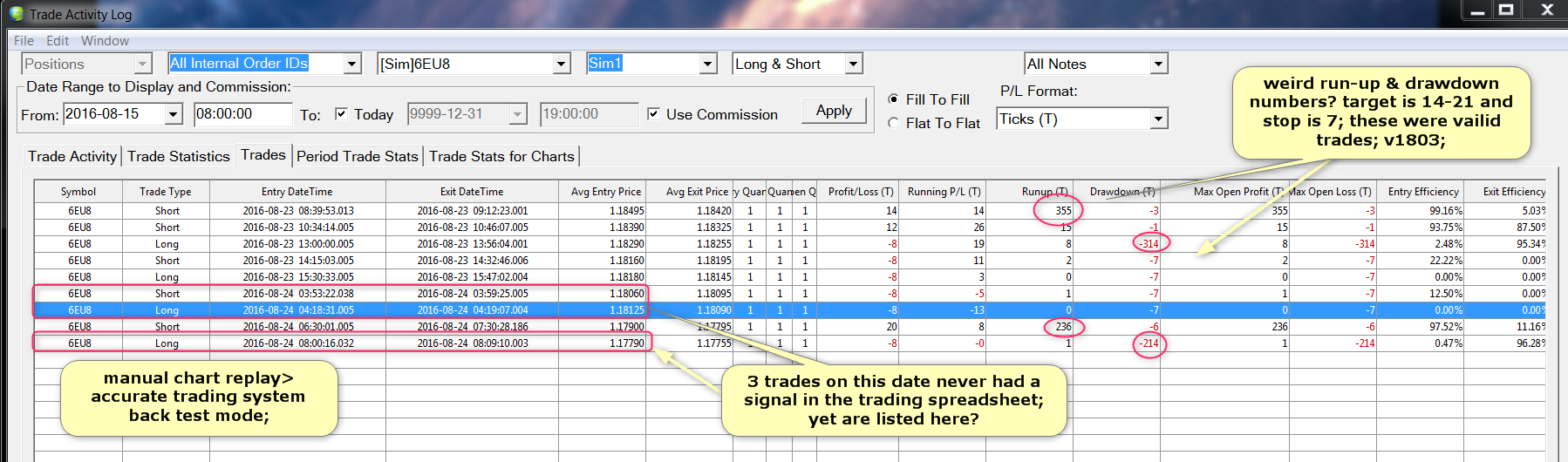 Searched for anything on this subject & find no answers; the Trade Activity Log is listing trades that never were triggered in the Spreadsheet Trading System. I did a short test and attached the outcome. I ran a backtest manually via Chart replay>Accurate Trading System BackTest Mode; out of 9 test trades only 6 were valid and signaled in the spreadsheet columns 'K or 'M'; I am either doing something wrong or lost at this point. I have in the past ran many backtests but never found this problem. It occurred in version 1727 so I upgraded to 1803 and still same fake trades. Can you guide me to a solution. Log and screen shots attached;
