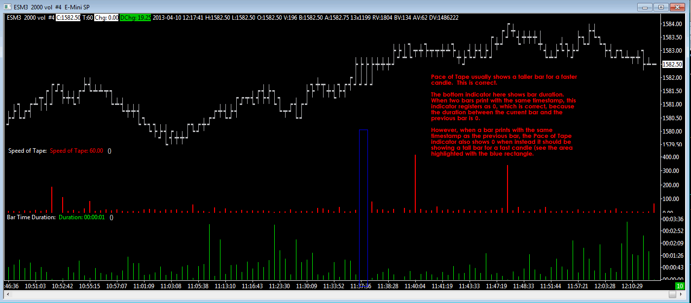 I've attached an image showing the problem with the Pace of Tape indicator. Pace of Tape shows taller bars for faster candles. This works correctly unless the time of a candle is 0 in which case Pace of Tape shows no bar when it should actually be showing the tallest bar possible. |