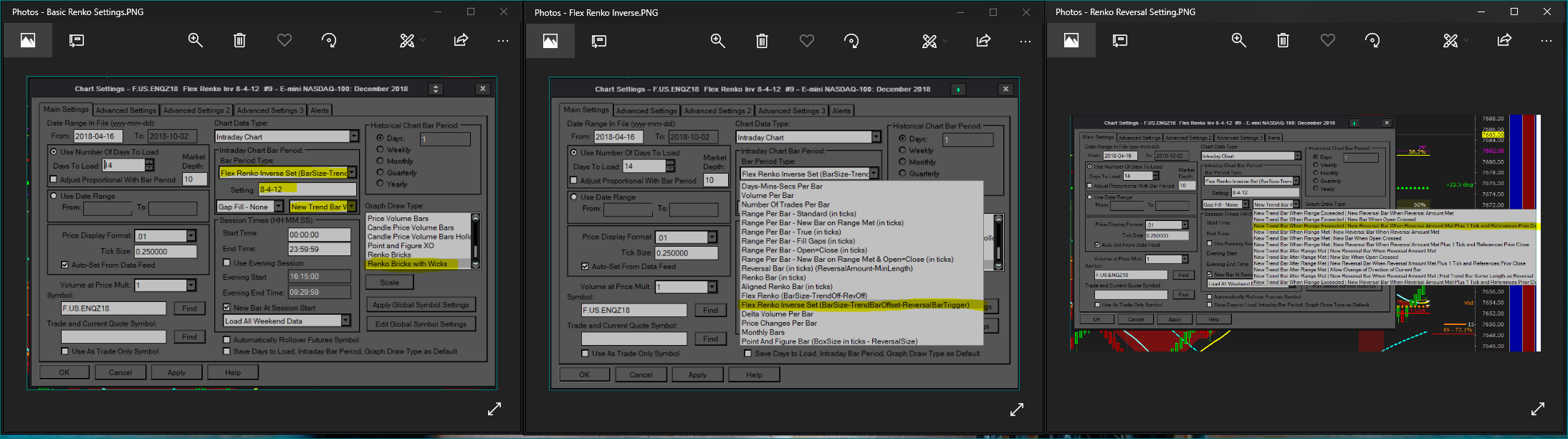 Kevin, that looks like one of my older Charts. If you need the specific settings for the current SC Renko implementation, this is what I'm currently using to mimic the NT Renko implementation. See the attached images for the settings. -- Scott |