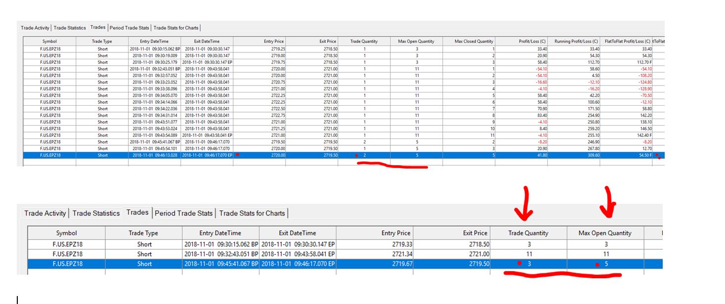 Thanks for Flat to Flat Please see attached for visual details. The 'Summary Trades Only For Trades List' enabled (flat to flat) in the Trade Activity Log > Trades tab > Trade Quantity for the recent closed trade(s) is not counting (summing) the last trade, until the next trade is opened and closed. After the next trade is closed, then the Trade Quantity is accurate. To test, go into sim mode, open two or three separate positions, then flatten them, then verify the accuracy of the Trade Quantity by comparing to Max Open Quantity or manually add the trades with 'Summary Trades Only for Trades List' disabled. You will find the last trade in the series is not accounted for. Then without doing anything else, open a few more positions, close them with flatten, and look back on at the 1st trade series, the Trade Quantity and Max Open Quantity will now be aligned, and this more recent trade series will be inaccurate, until the next trade. Thanks Mark |